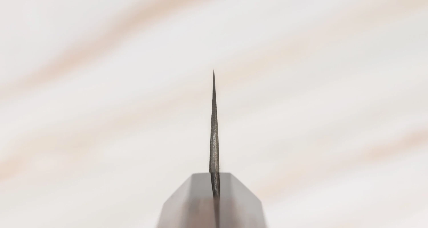 It has a double bevel (symmetrical) blade with convex (full hamaguri) grind. Hamaguri grind allows superior sharpness that requires delicate handling and helps to prevent food from sticking to the blade. Such a shape keeps a lot of metal behind the edge and makes for a stronger edge, yet it still allows a good degree of sharpness. The downside to a convex grind is that it is very hard to reproduce by anyone other than a very experienced sharpener.