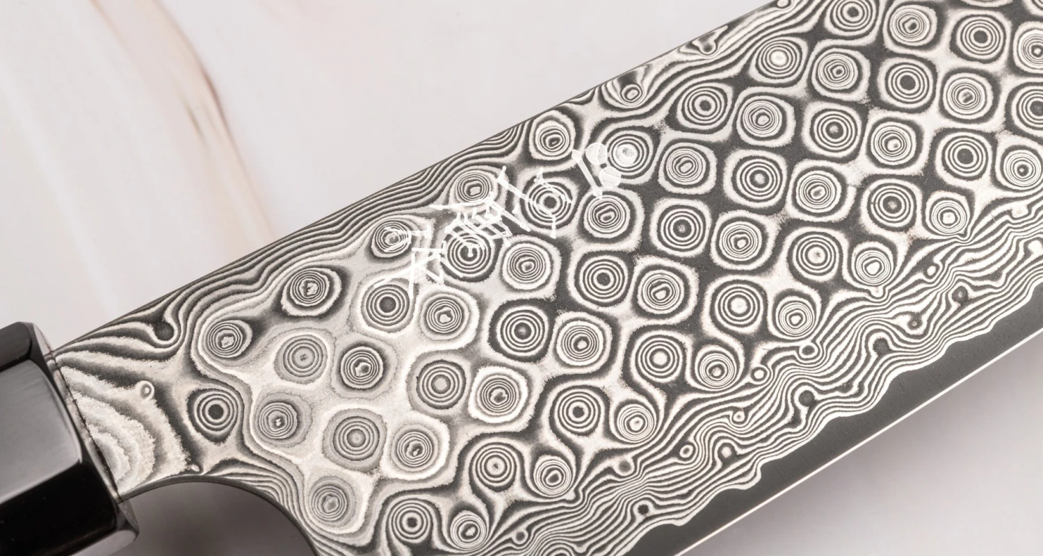 Itโs hard not to notice the eye-catching and masterfully made damascus finish on the blade, which is dotted with circular elements, also known as a raindrop damascus pattern. This kind ofย damascus finish, also calledย the โAnmonโ technique,ย is now almost a trademark for Nigara Hamono and draws its inspiration fromย the majestic Anmon Waterfalls and the breathtaking sight of rippling water beneath them.