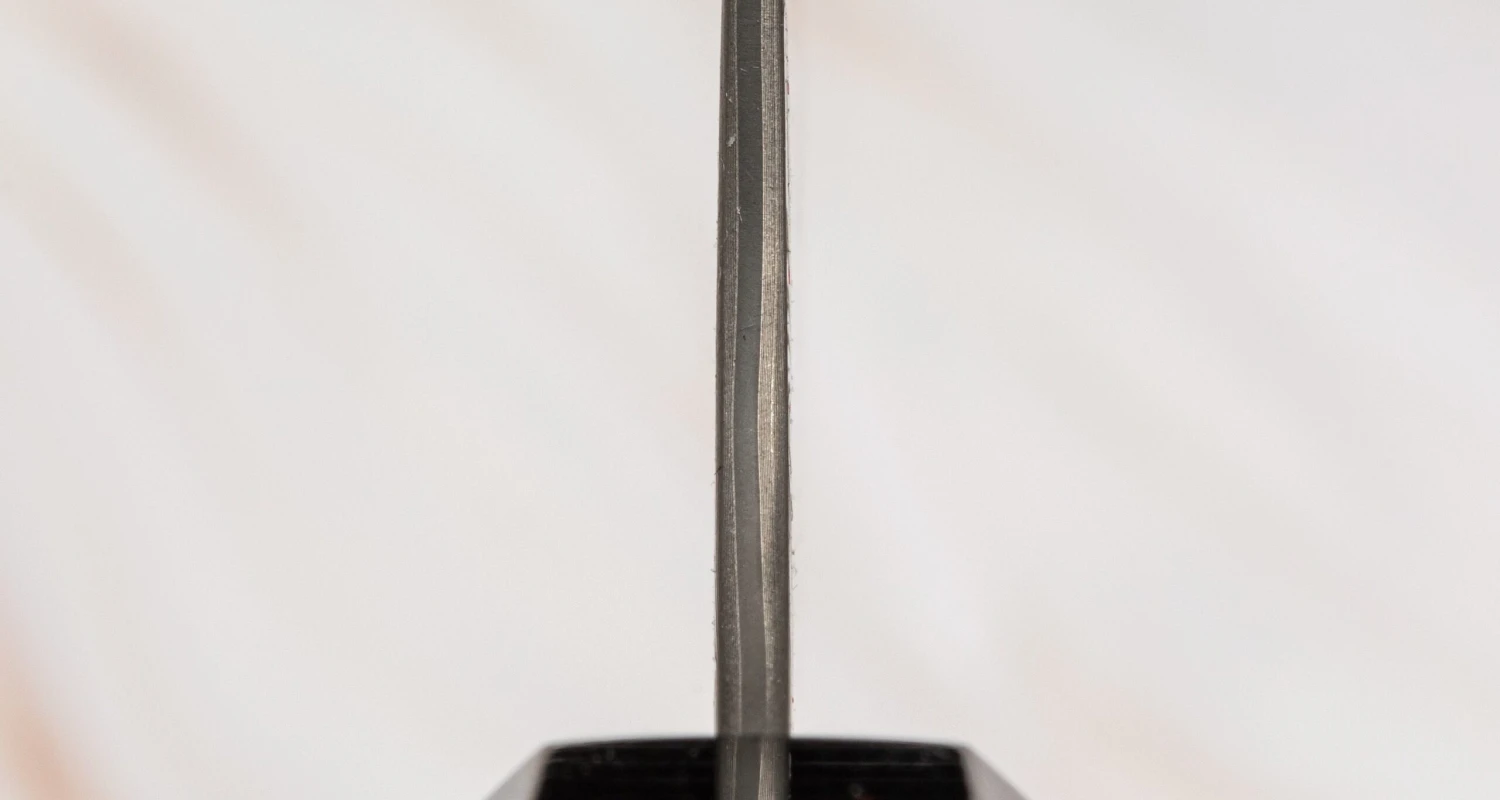 It has aย double bevel (symmetrical) blade with convex (full hamaguri) grind. Hamaguri grindย allows superior sharpness that requires delicate handling and helps to prevent food from sticking to the blade. Such a shape keeps a lot of metal behind the edge and makes for a stronger edge, yet it still allows a good degree of sharpness. The downside to a convex grind is that it is very hard to reproduce by anyone other than a very experienced sharpener.