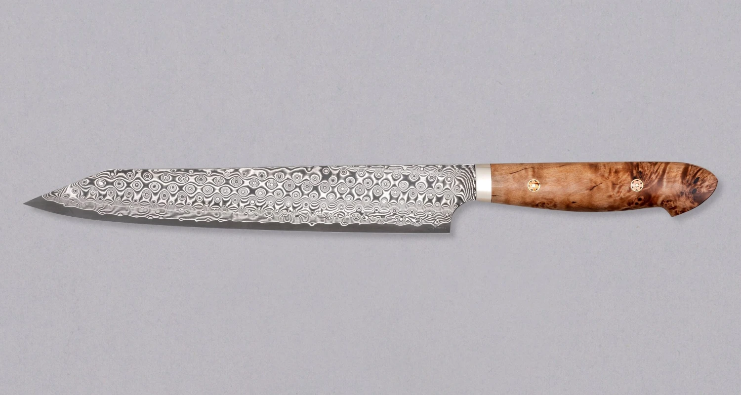 Nigara Kiritsuke-Sujihiki SG2 Damascus Maplewood 255mm is a traditional Japanese knife used for preparing meat and raw fish. Its length allows the user to slice different types of protein in one single pulling motion, that will – together with the razor-sharp double bevel blade – birth smooth, shiny cuts. The name kiritsuke refers to the tanto tip, which is, besides looking awesome, also an homage to the katana. Its SG2 powder steel core insures long-lasting sharpness with little to no maintenance, as the steel resists corrosion very well.