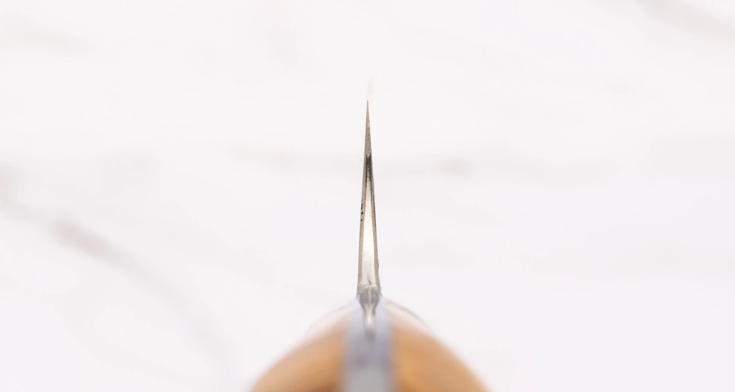 It has a double bevel (symmetrical) blade with convex (full hamaguri) grind. Hamaguri grind allows superior sharpness that requires delicate handling and helps to prevent food from sticking to the blade. Such a shape keeps a lot of metal behind the edge and makes for a stronger edge, yet it still allows a good degree of sharpness. The downside to a convex grind is that it is very hard to reproduce by anyone other than a very experienced sharpener.