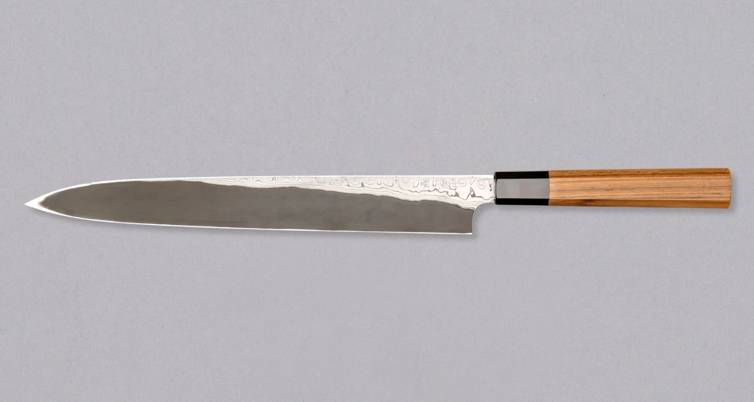 Yanagiba (literally ‘willow’, as its shape is reminiscent of a willow leaf) is one of the three traditional Japanese knives (besides deba and usuba), and it’s used for slicing raw fish. They have a single bevel, which can achieve a much finer sharpness – this is key if you want the cut to be as clean and smooth as possible. Yanagiba knives are usually 240-360 mm long, which allows the user to slice the sashimi in a single pulling motion to prevent any shredded, zigzag cuts that would result in damaged food tissue.
