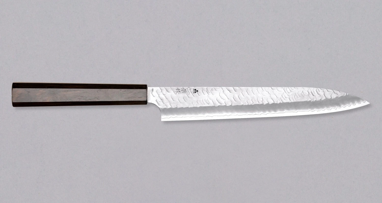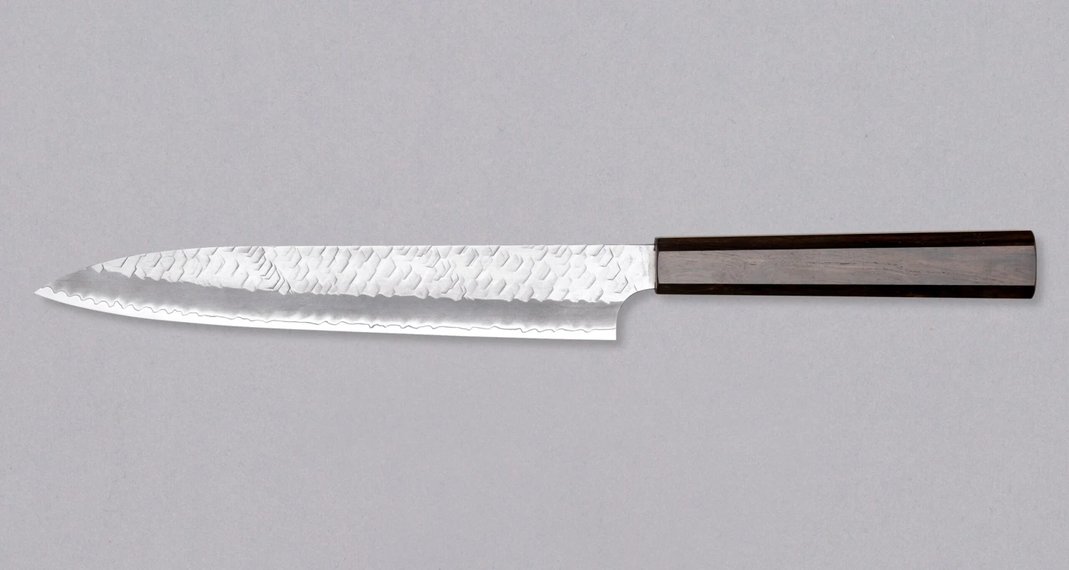 Nigara Sujihiki SG2 Tsuchime Wa Ebony 240mm is a traditional Japanese knife used for preparing meat and raw fish. Its length allows the user to slice different types of protein in one single pulling motion, which will – together with the razor-sharp double bevel blade – birth smooth, shiny cuts. The hollow grind geometry of the blade, combined with the unique hammer strokes, ensures that ingredients do not stick to the blade during cutting, allowing for faster and more precise work. Its SG2 powder steel core ensures long-lasting sharpness with little to no maintenance.
