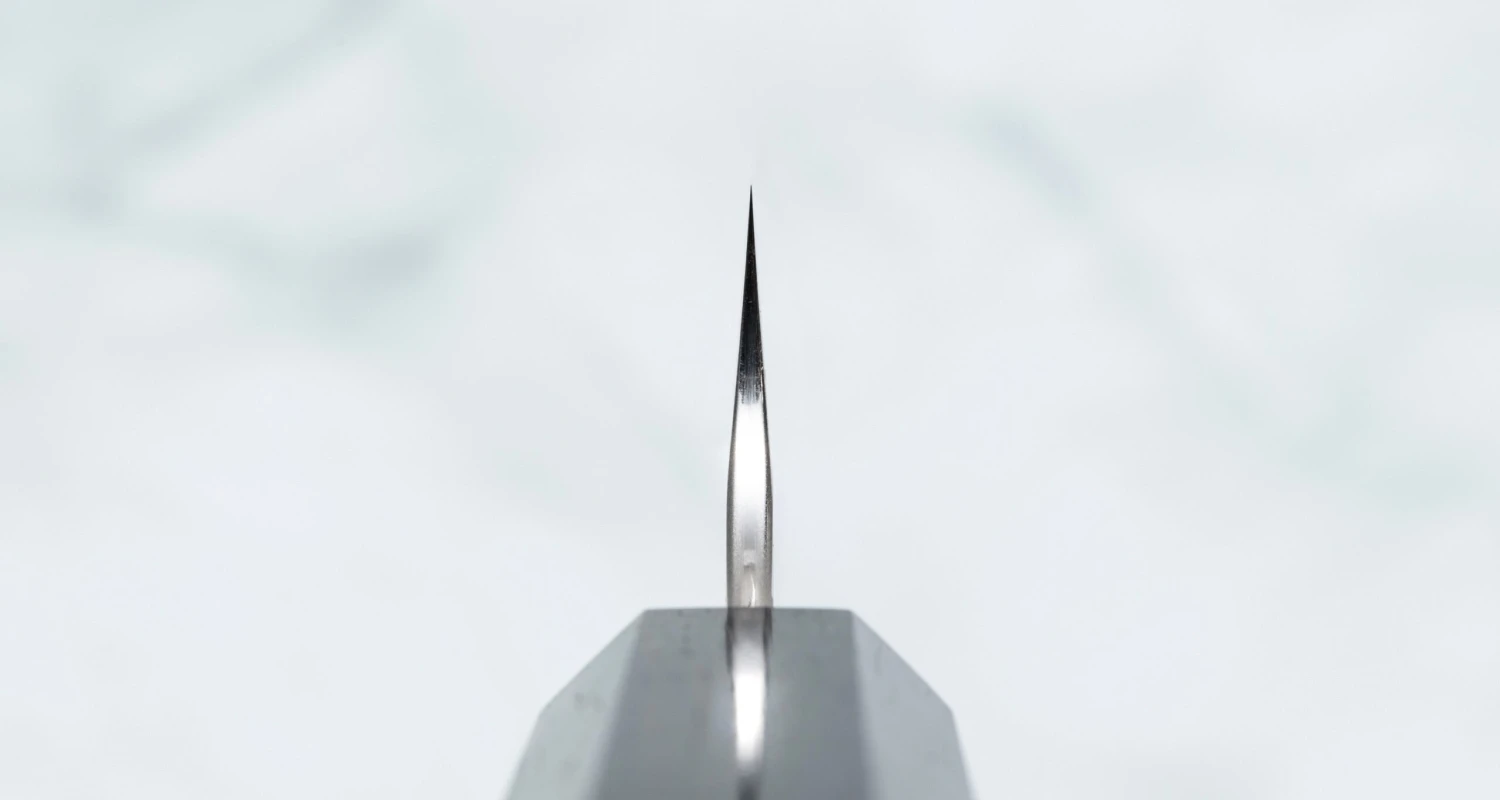 It has a double bevel (symmetrical) blade with convex (full hamaguri) grind. Hamaguri grind allows superior sharpness that requires delicate handling and helps to prevent food from sticking to the blade. Such a shape keeps a lot of metal behind the edge and makes for a stronger edge, yet it still allows a good degree of sharpness. The downside to a convex grind is that it is very hard to reproduce by anyone other than a very experienced sharpener.