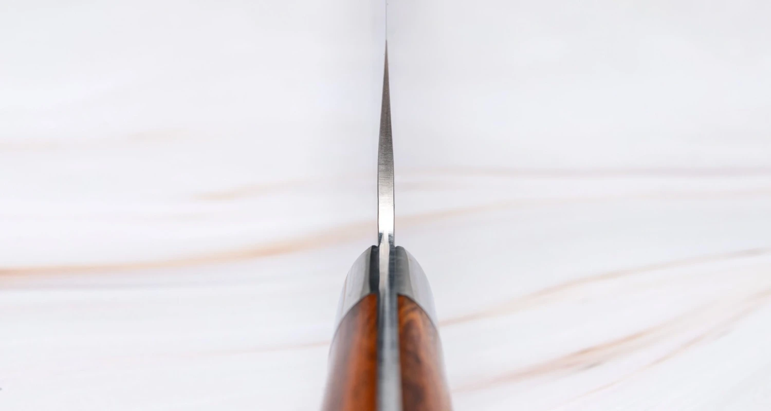 A high hardness of around 63 HRC means that the blade won’t be very tough, so the blade’s core was laminated using the san-mai method to improve its structural integrity and subsequent ability to withstand impacts and prevent chipping. San-mai translates to “three layers” in Japanese, referring to a blade that is composed of a primary, inner layer of harder steel (hagane) and of two secondary, outer layers of softer steel (jigane) that protect the prior.