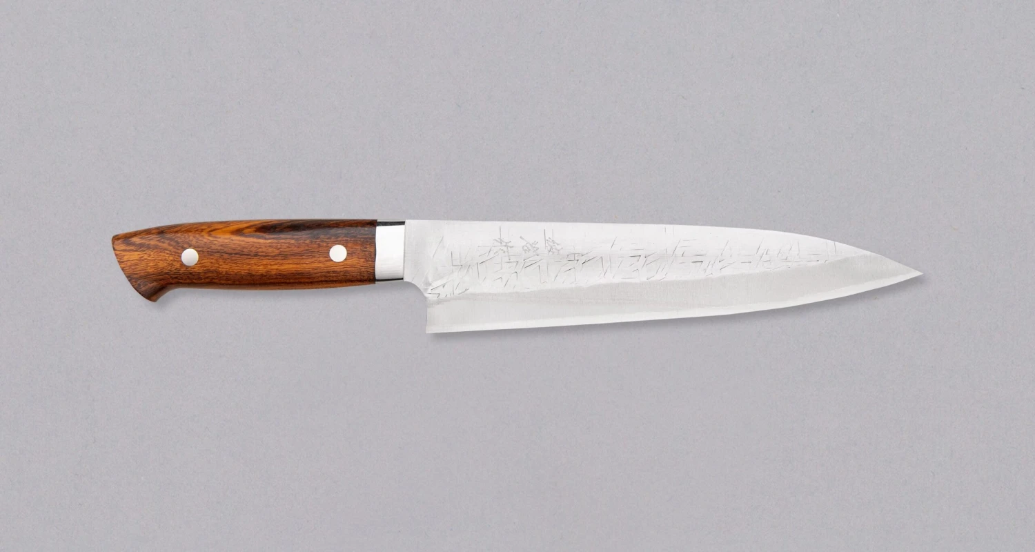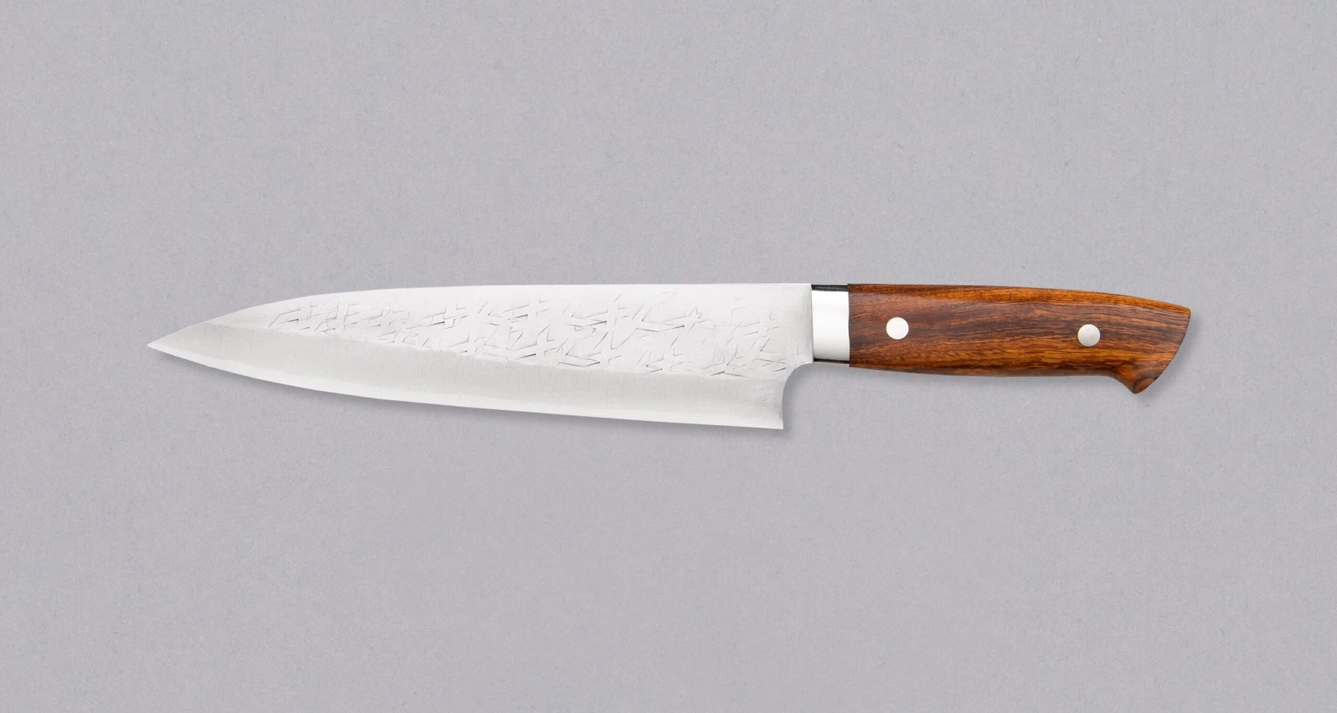 Gyuto is the most versatile and useful blade shape in the modern kitchen. It has a wide profile for easy food transfer and tends to be fairly flat towards the heel, enabling easy and fast chopping on the cutting board. A pointed tip allows piercing and precise, delicate work. A slight curve between the tip and the midsection makes the belly great for rocking the blade back and forth when cutting. It can be used for cutting meat, fish and vegetables.