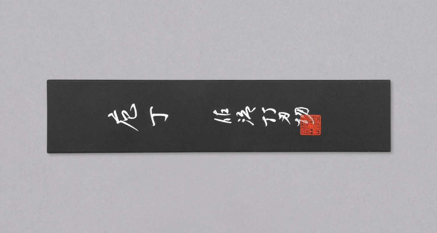 The surface of the blade was treated with a special textured hammer, leaving complex geometric impressions on its upper part. The lower part of the blade was treated to a high-polish, which ends at the hamon, which is the thin line flowing along the cutting edge. It shows the border between the hagane (blade’s core) and jigane (outer layers).