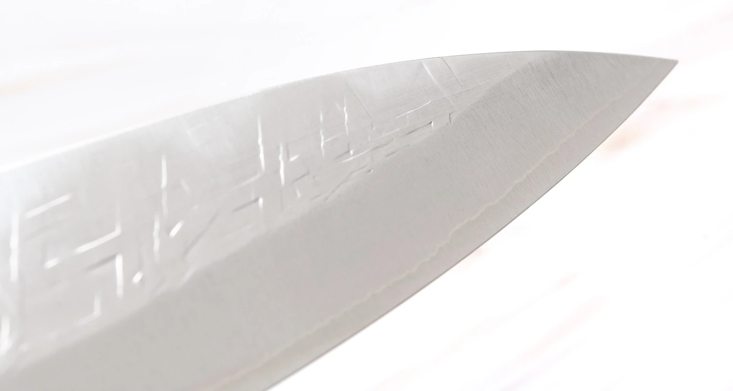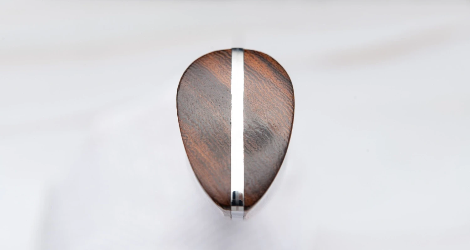 A high hardness of around 63 HRC means that the blade won’t be very tough, so the blade’s core was laminated using the san-mai method to improve its structural integrity and subsequent ability to withstand impacts and prevent chipping. San-mai translates to “three layers” in Japanese, referring to a blade that is composed of a primary, inner layer of harder steel (hagane) and of two secondary, outer layers of softer steel (jigane) that protect the prior.