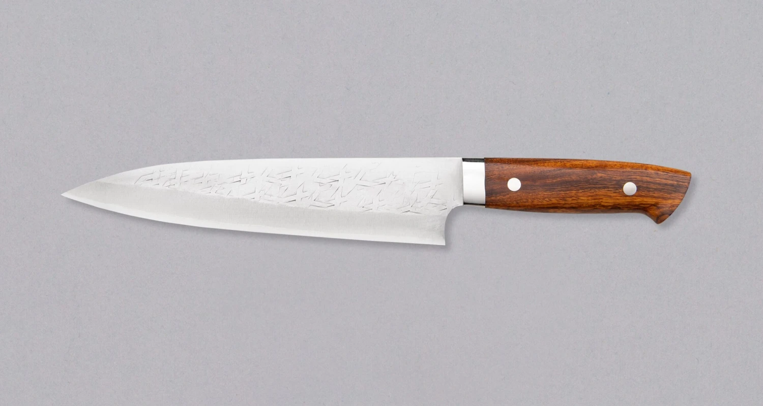 Gyuto is the most versatile and useful blade shape in the modern kitchen. It has a wide profile for easy food transfer and tends to be fairly flat towards the heel, enabling easy and fast chopping on the cutting board. A pointed tip allows piercing and precise, delicate work. A slight curve between the tip and the midsection makes the belly great for rocking the blade back and forth when cutting. It can be used for cutting meat, fish, and vegetables.