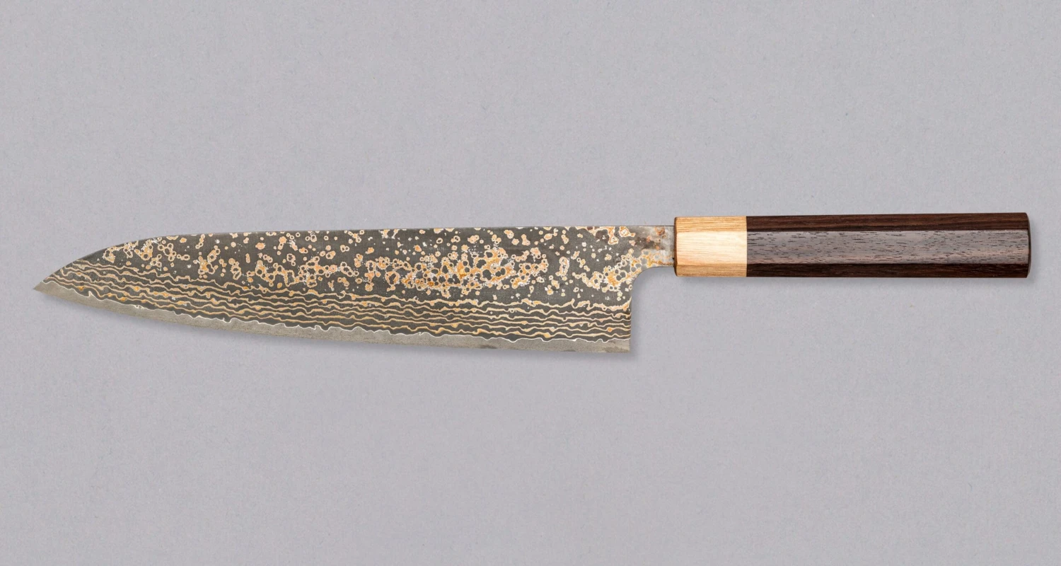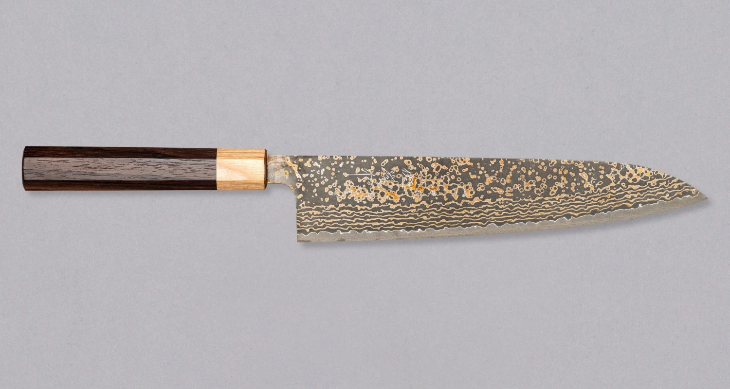 Saji Gyuto VG-10 Gold RWO 240mm is a versatile Japanese kitchen knife suitable for preparing meat, fish and vegetables. However, it would be an injustice to call it just a kitchen knife, as it is a remarkable example of blacksmith’s craftsmanship – from its unique design to its very specific features.
