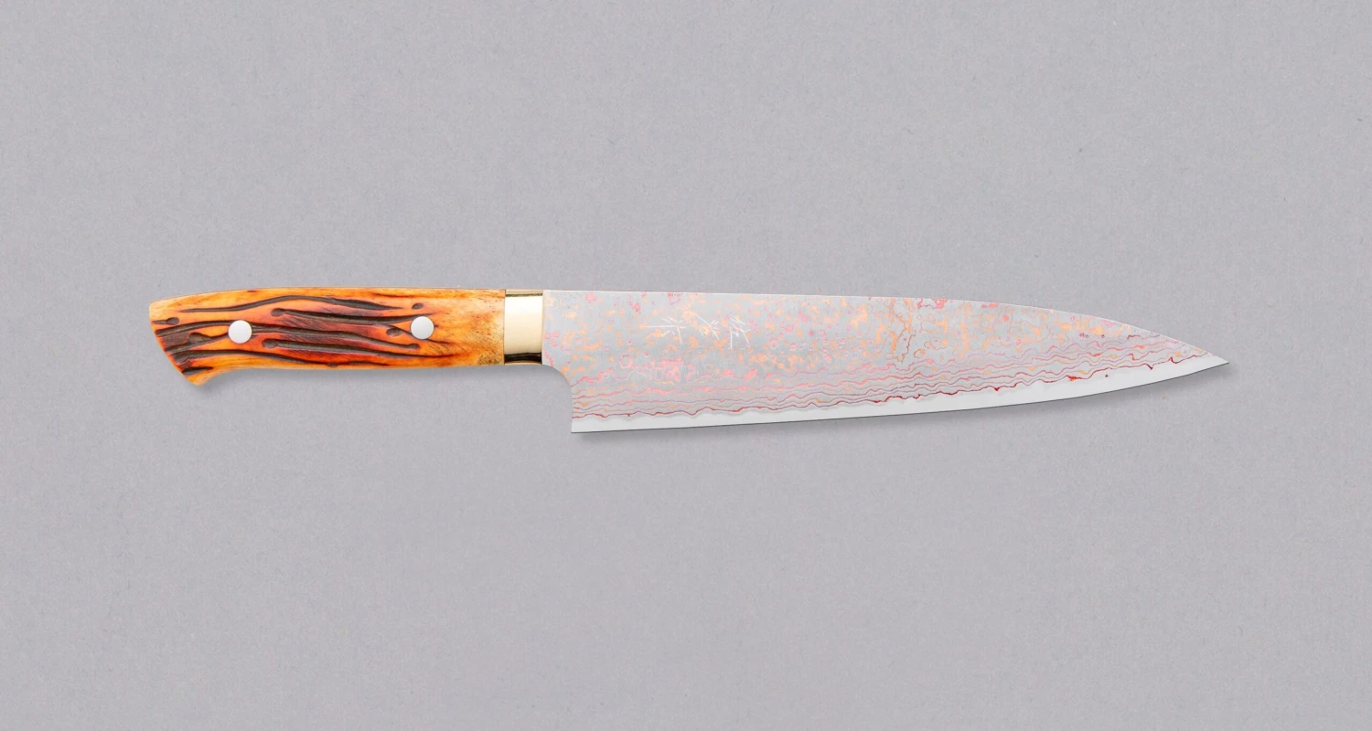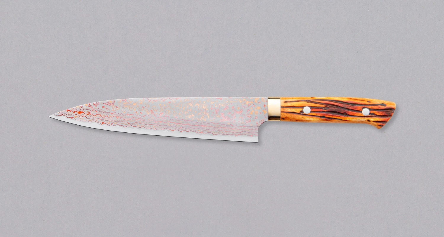 This gyuto was fitted with a daring western style (Yo) handle made out of cow bone, which had pigments added to it to achieve a flashy orange color.