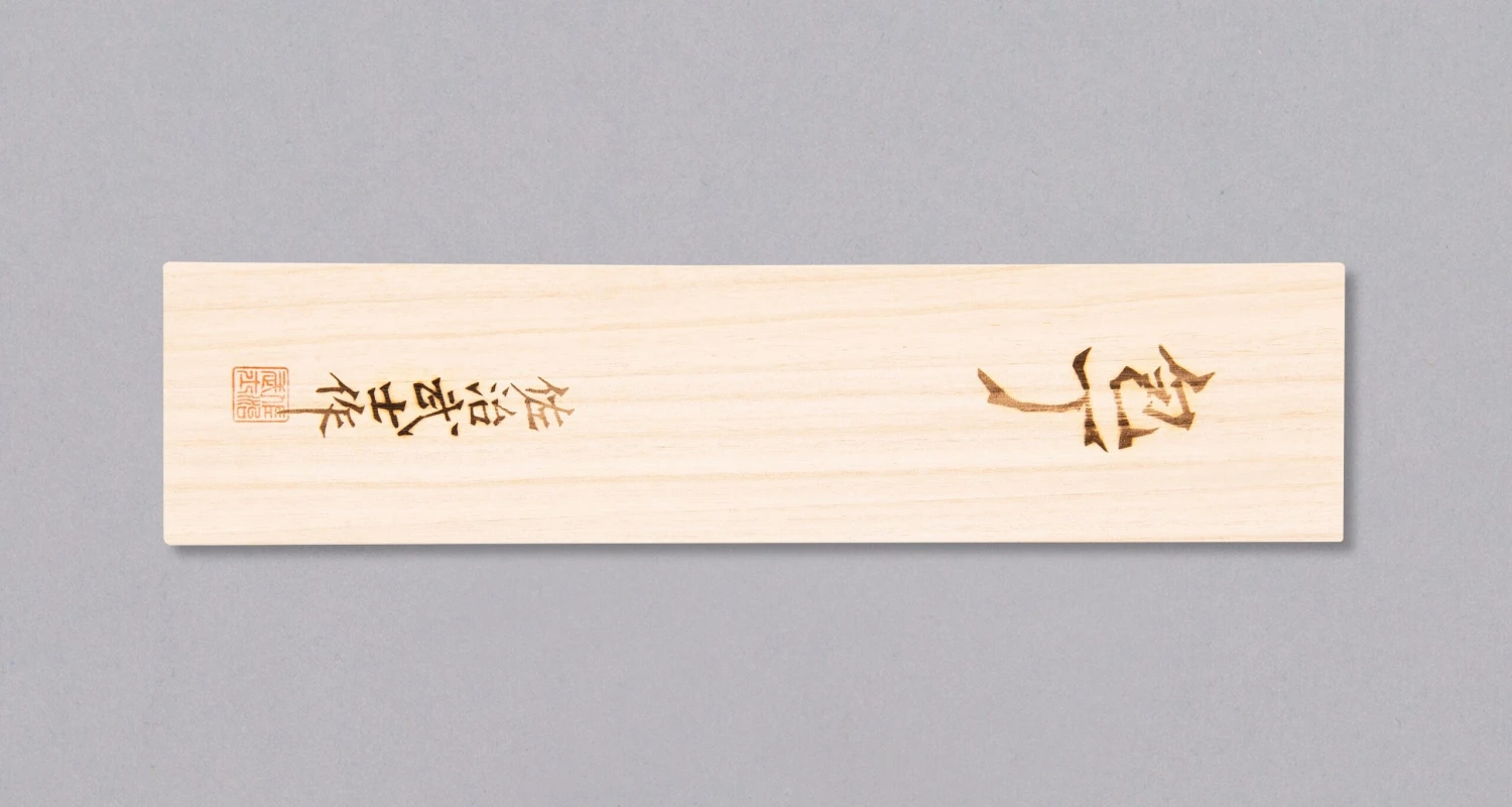 Master Takeshi Saji, known for his eye-catching and extravagant knives, played on the golden-orange hues of his now almost signature rainbow damascus finish and matched them with a striking cow bone handle. The latter might not be for everybody, but it makes this knife a very special piece. Etched tiger stripes flowing along the handle give the knife a primal look, and it has just as big an appetite for food as a hungry tiger waiting on its prey.
