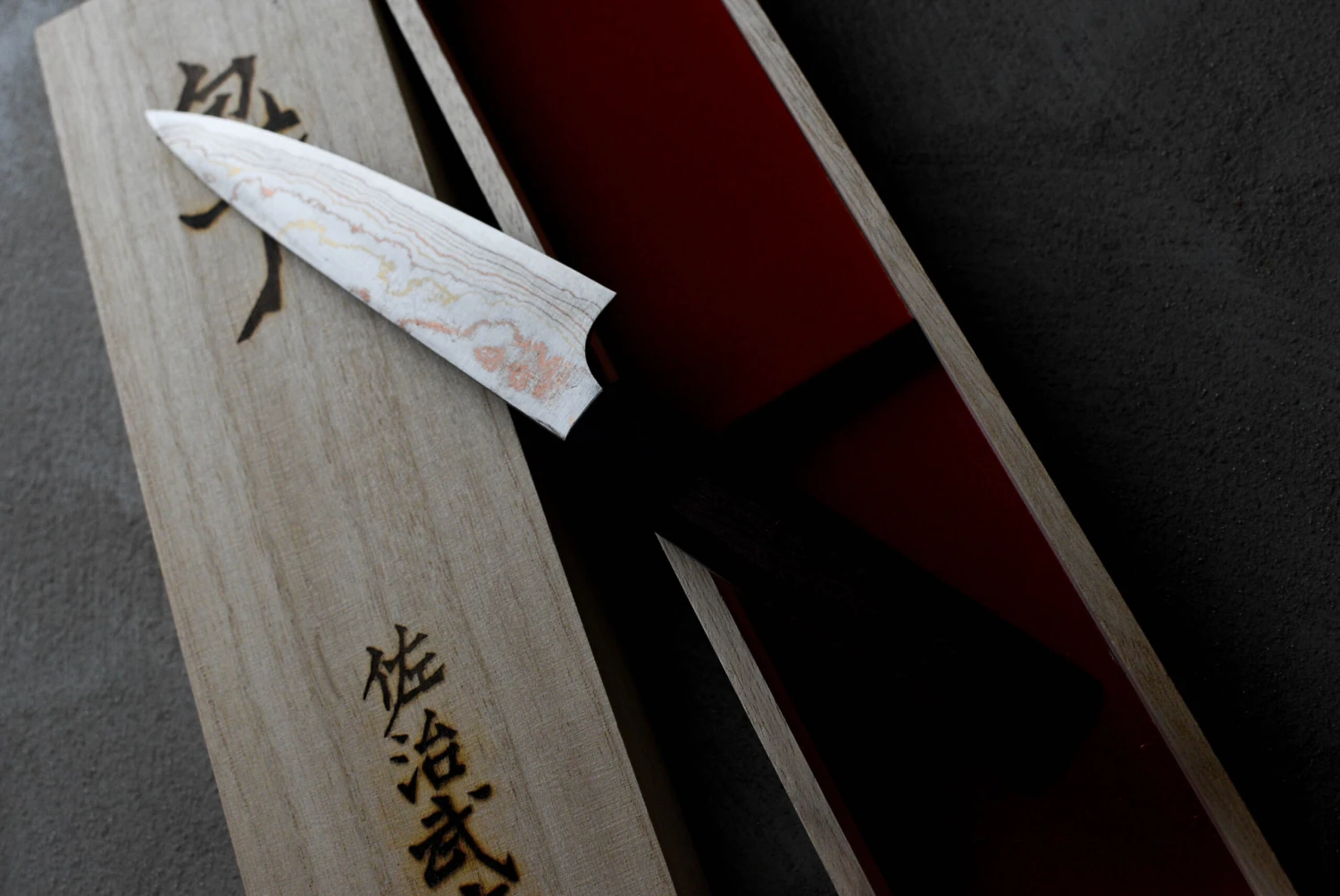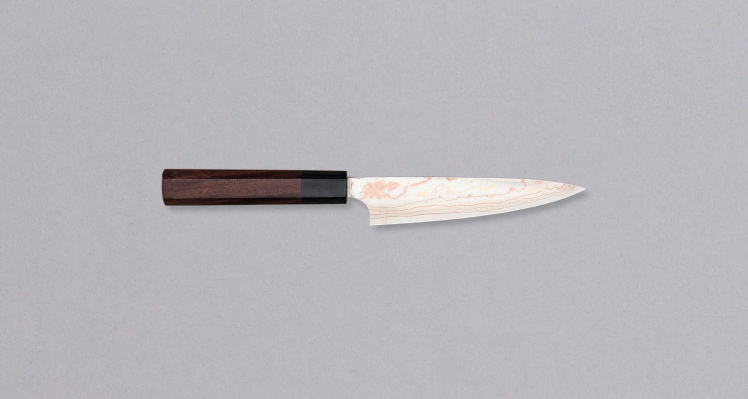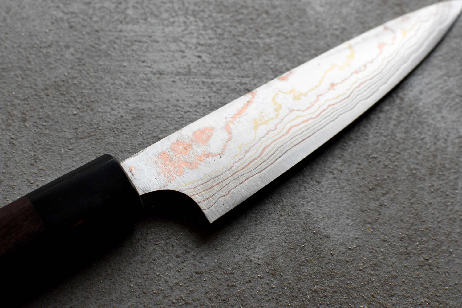 Saji Petty Rainbow Damascus 135mm (5.3″) is definitely not just a looker. If you check under the hood, you will find some amazing specs there too. The core of this knife is made of high-carbon Aogami #2 (Blue) steel, tempered to around 62-63 HRC. The core is clad with multiple layers of rust-resistant stainless steel to which brass and copper were added, producing a beautiful, iridescent rainbow Damascus pattern that gives these knives their name.