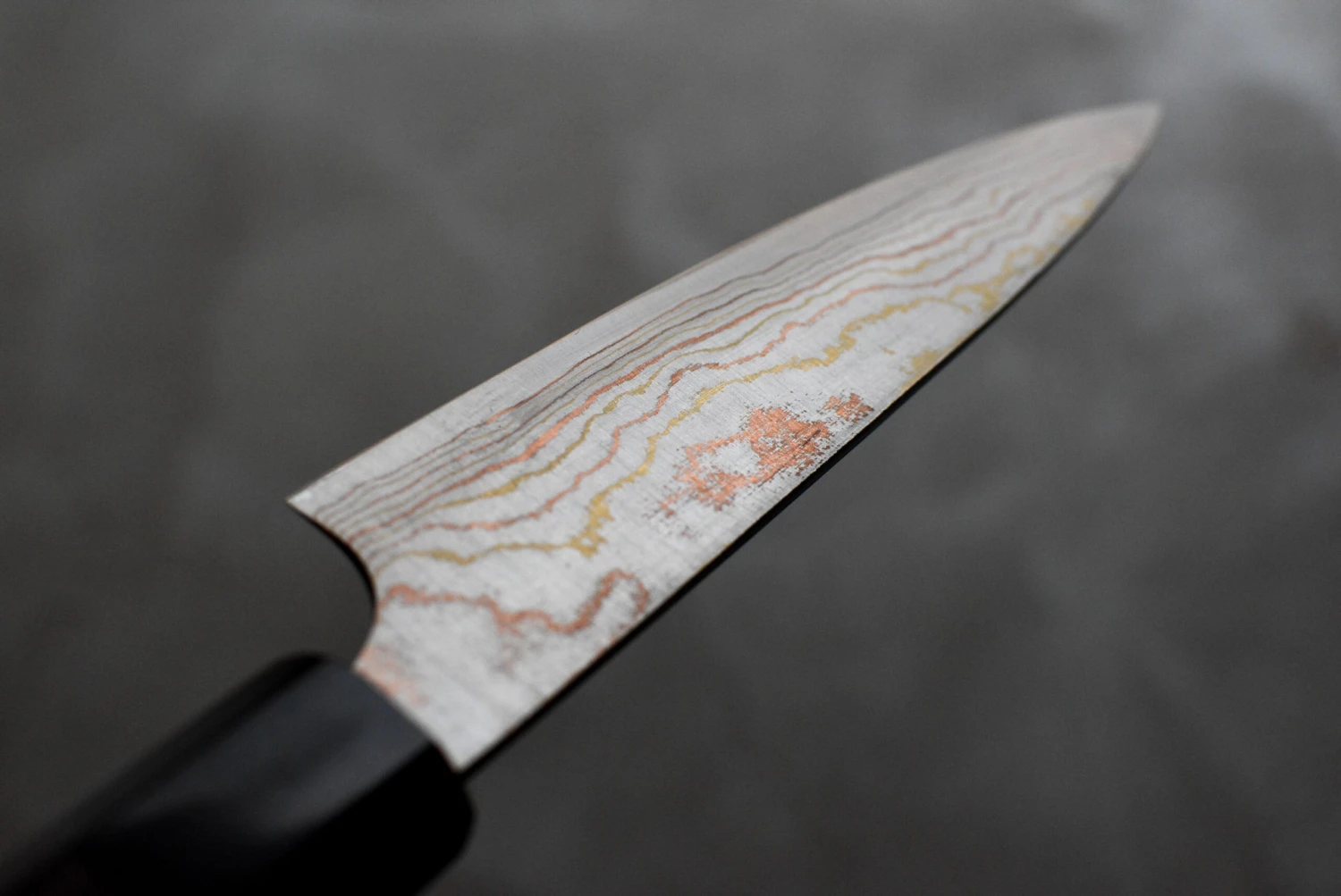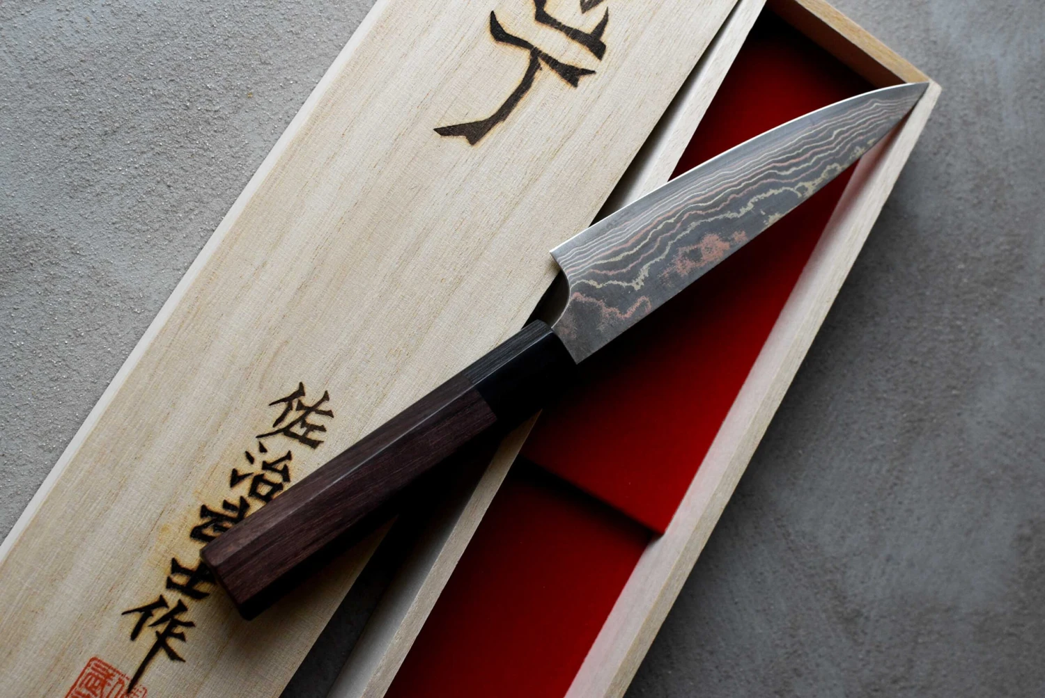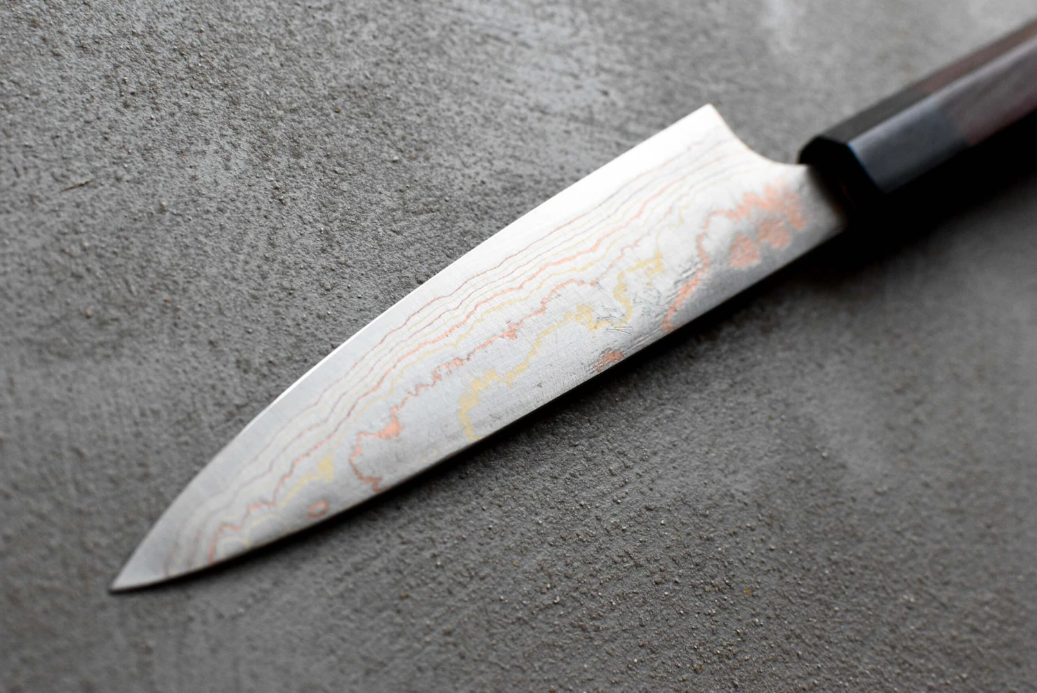 Saji Petty Rainbow Damascus 135mm (5.3″) is definitely not just a looker. If you check under the hood, you will find some amazing specs there too. The core of this knife is made of high-carbon Aogami #2 (Blue) steel, tempered to around 62-63 HRC. The core is clad with multiple layers of rust-resistant stainless steel to which brass and copper were added, producing a beautiful, iridescent rainbow Damascus pattern that gives these knives their name.