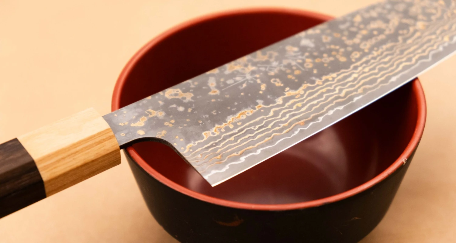 The bladeโs unique look was achieved by wedging the blade’s core between layers of softer, rust-resistant stainless steel, to which brass and copper were added. This lamination style is also calledย san-mai lamination. The result is a beautiful dark rainbow-colored damascus pattern, from which these knives got their name. This is not just a cosmetic feature, though, as the outer layers improve the knife’s structural integrity and help prevent breakage, as well as any other damage such as corrosion of the blade.