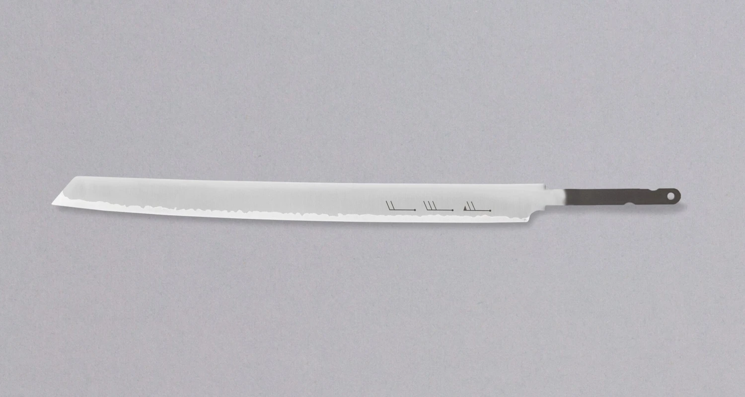 The shape of Burja is unique, although at first sight resembles otherย prosciutto knives. It has an extremelyย thin spineย of the blade at 1.8mm. The blade isย 300mm (11.8″) longย and finishes with a thin, pointy tip, revealing its origins and traditions of blacksmiths that were once forging katanas.