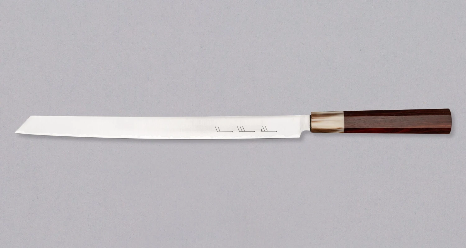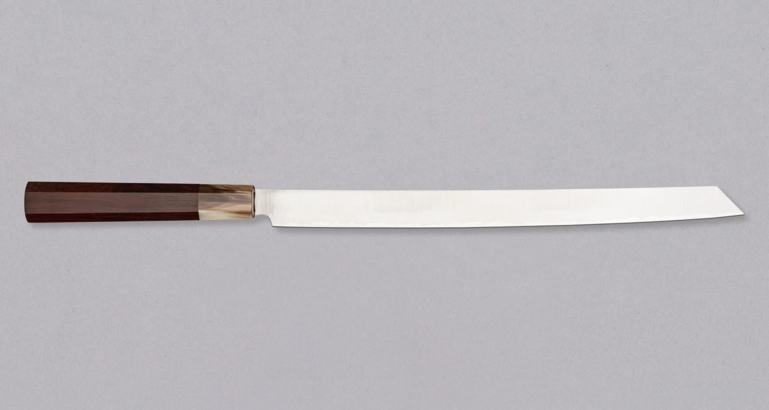 Powder steel knives are next level and we have something limited and rare on deck. Introducing the SG2 Burja – Prosciutto Knife Sandalwood 300mm (11.8″). This limited edition Burja is made from premium powder steel, SG2, and features a traditional octagonal sandalwood handle. Limited stock.