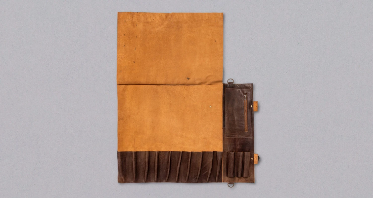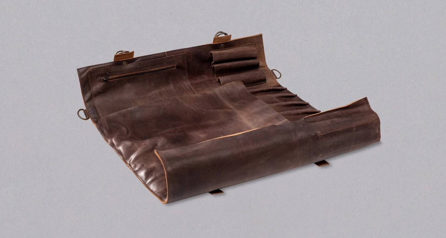 Chef’s Leather Knife Roll is made of dark brown leather and includes: