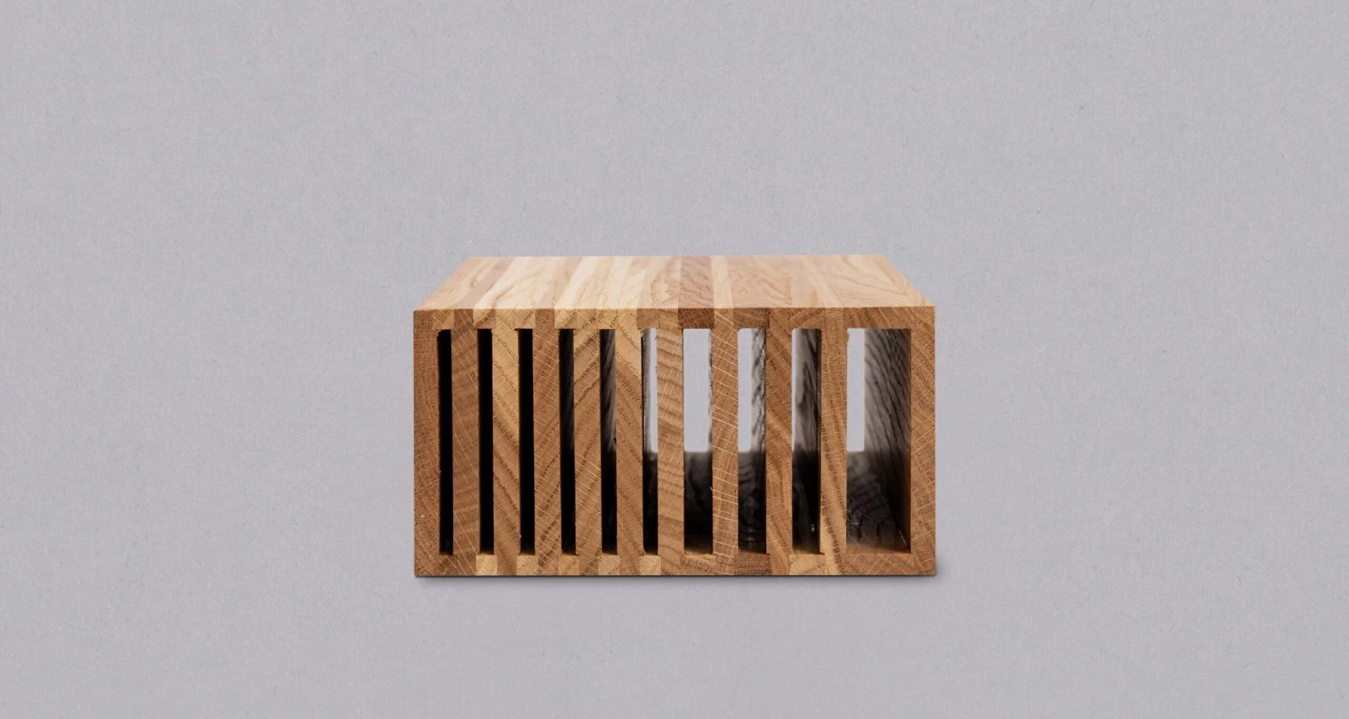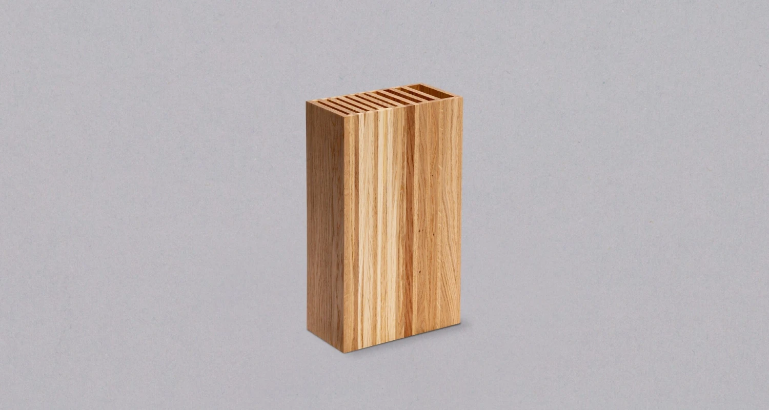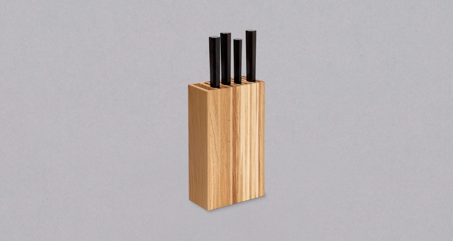SharpEdge knife holders are entirely handmade from oak wood by the Slovenian carpenter Simon ลฝvanut (Monoles). We like the contrast between the warmth of the wood and the coldness of the steel.