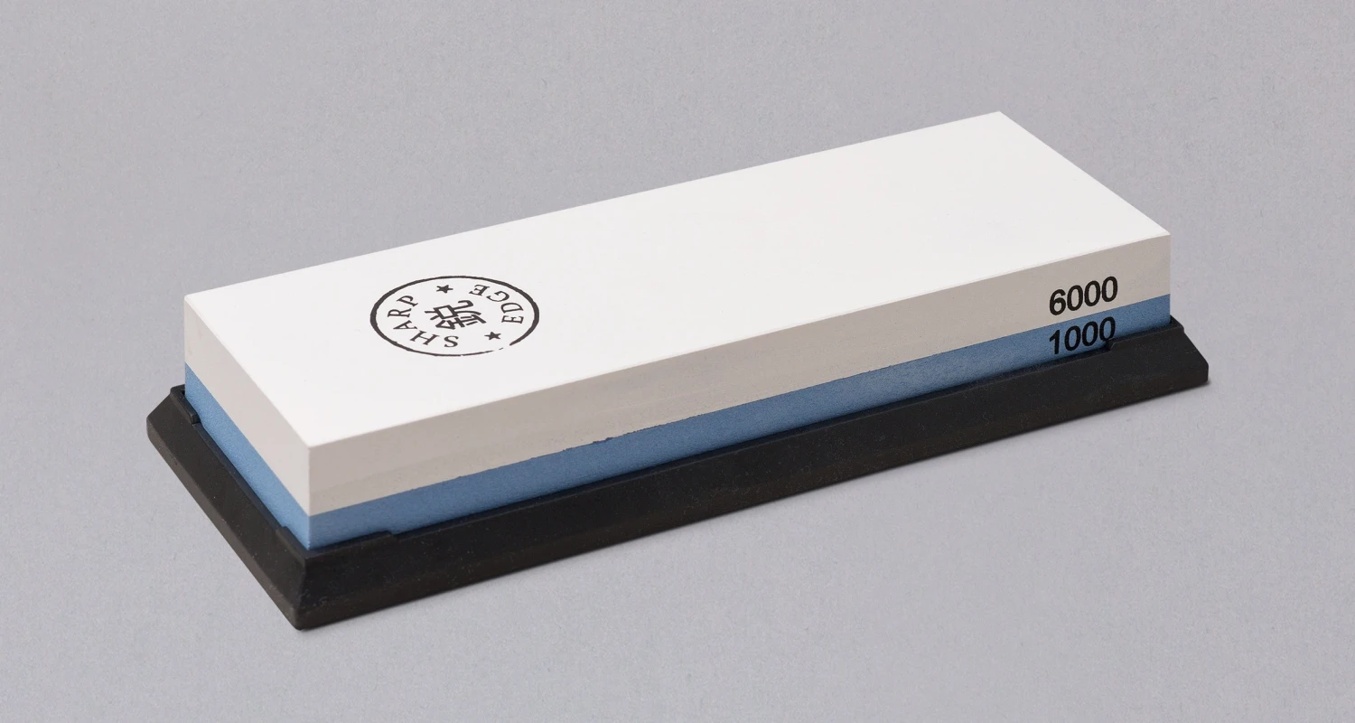 We recommend our #1000/#6000 grit combination whetstone for any knives, Japanese or other kind. #1000 grit is the most common general sharpening granulation (to put a new edge on a blunt knife), while #6000 grit is a fine granulation for the finishing edge and the final polish of the blade.