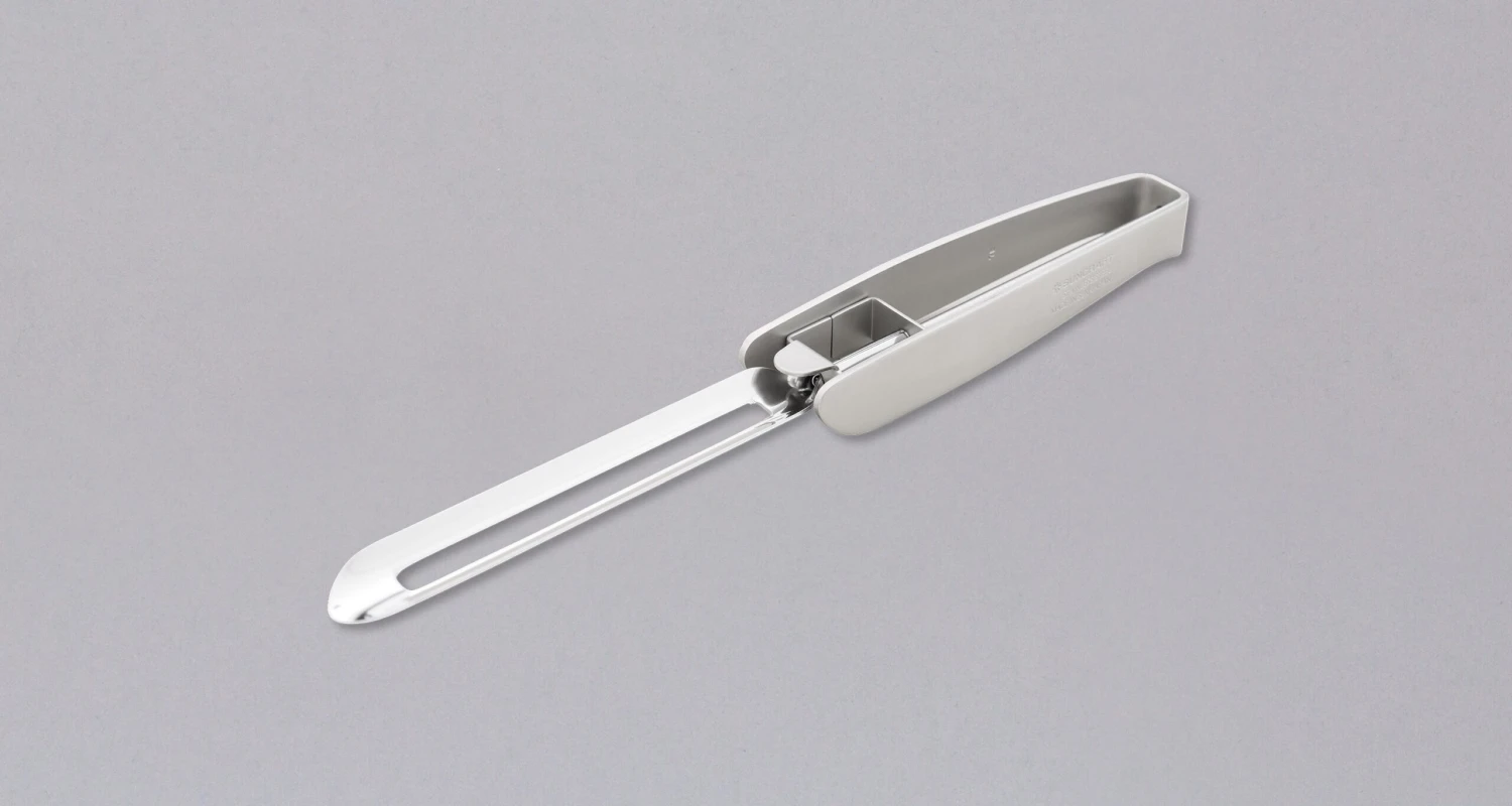 Large swivel peeler from Japanese manufacturer Suncraft is made of very sharp, precise and thin stainless steel. Due to its thin sharp blade, the effort when peeling will be minimal (reducing fatigue in your hands), and at the same time reduces the amount of waste. The top of the peeler can be used to remove potato eyes.