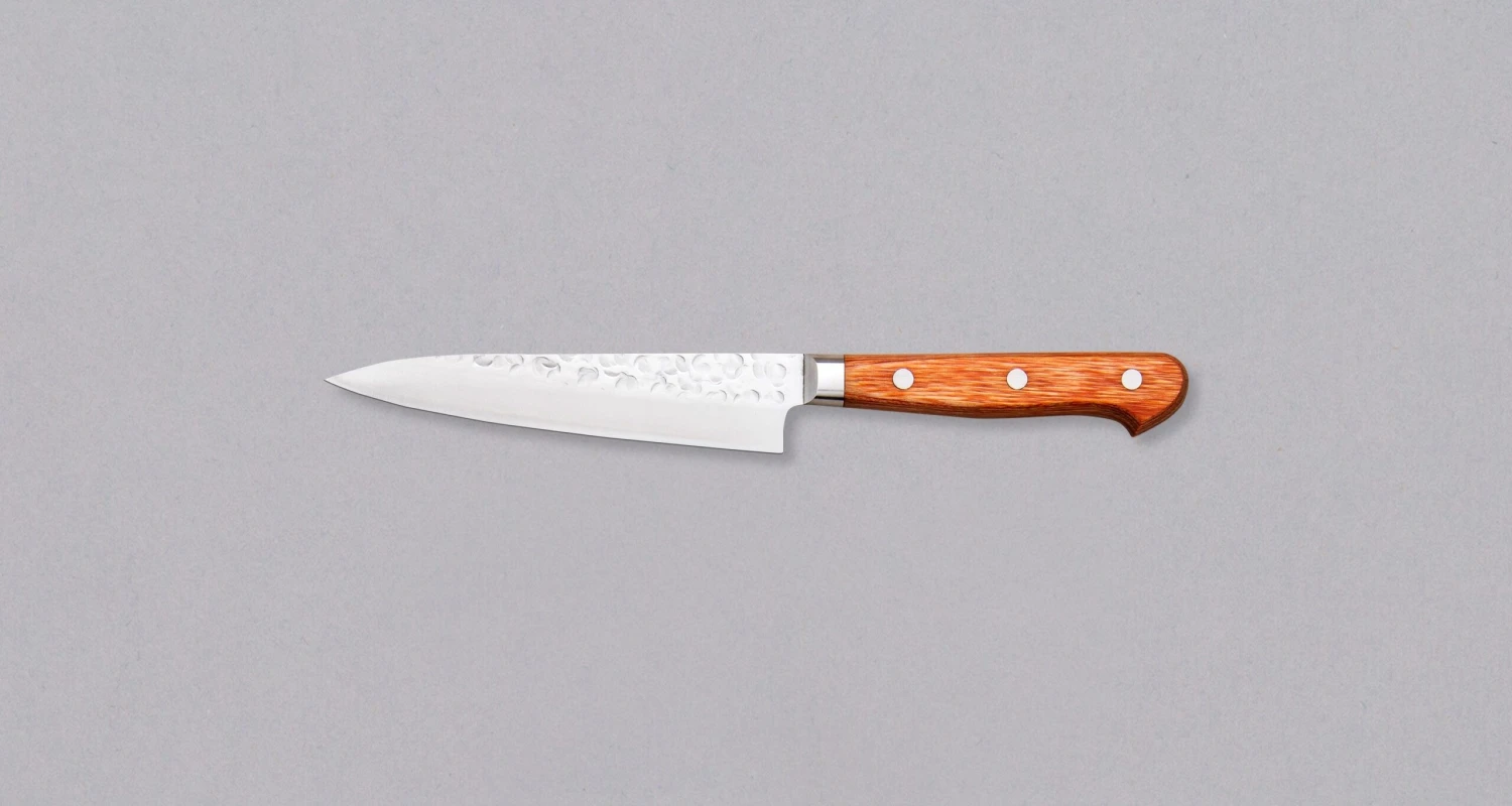 Takamura Petty Tsuchime Chromax Brown 130mm is a multi-purpose Japanese kitchen knife that won’t require you to break the bank. It’s the first knife that we offer made of Chromax steel, which is a new kitchen knife steel with some enviable attributes. It’s very hard (64-65 HRC), easy to sharpen and semi-stainless, which means it will resist corrosion better than traditional high-carbon Japanese knife steels. Together with a high-quality western (Yo) style pakka wood handle, this is a real performer made for anyone looking to get the maximum out of their knife.