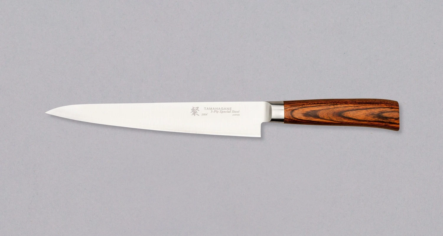 Tamahagane San Sujihiki (or slicer) knife is primarily intended for long pulls and precise cuts of meat and fish. The 210mm (8.3″) version is the shortest of the sujihikis, designed for small to medium-sized fish and pieces of meat. It is also suitable for those with a limited workspace or a small kitchen.