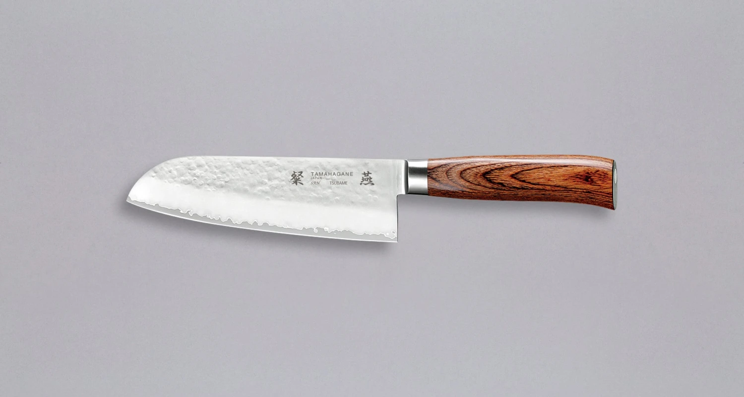 The Tamahagane Tsubame Santoku with a 175mm (6.9″) is a versatile knife, perfect for a wide range of cutting and chopping tasks on a cutting board. It is a fantastic choice when buying your first knife, as it will give you a gentle nudge – admittedly past the point of no return – into the world of insanely sharp Japanese knives. The blade is also suitable for work in a professional environment.