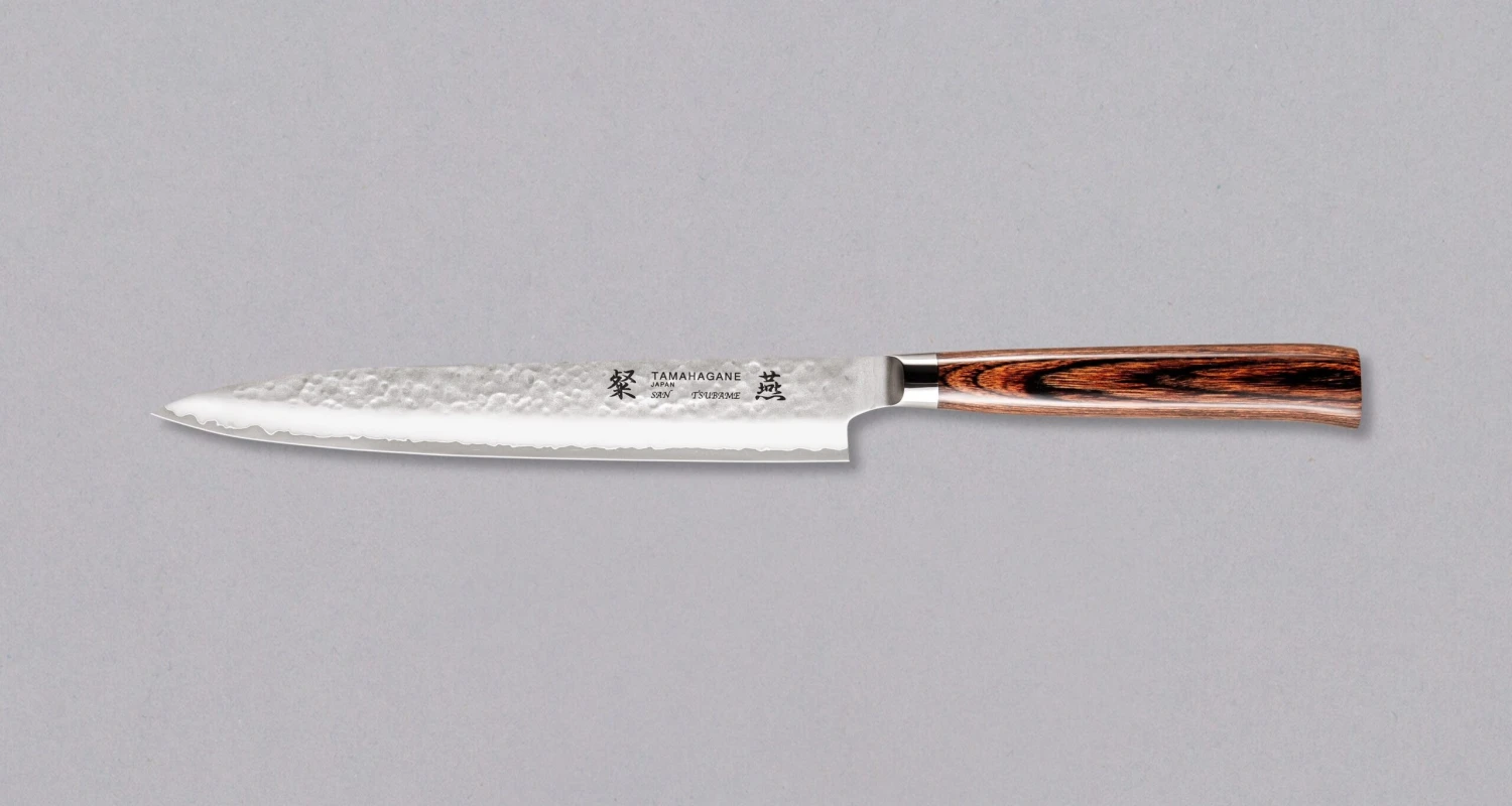 Tamahagane Tsubame Sashimi-Slicer knife is primarily intended for long pulls and precise cuts of meat and fish. The 210mm (8.3″) version is the shortest of the slicers, designed for small to medium-sized fish and pieces of meat. It is also suitable for those with a limited workspace or a small kitchen.