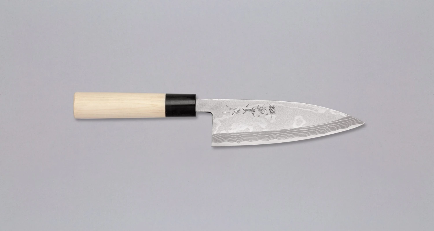 Deba, a heavy traditional Japanese knife for rougher tasks made by the one and only Shigeki Tanaka. The knife is chisel ground (single bevel) and is suitable only for right-handed users. The blade is forged in Aogami #2 Blue steel and contains a large, round, traditional handle. On top is a 17-layer gorgeous Damascus pattern which makes this Deba a one-of-a-kind!
