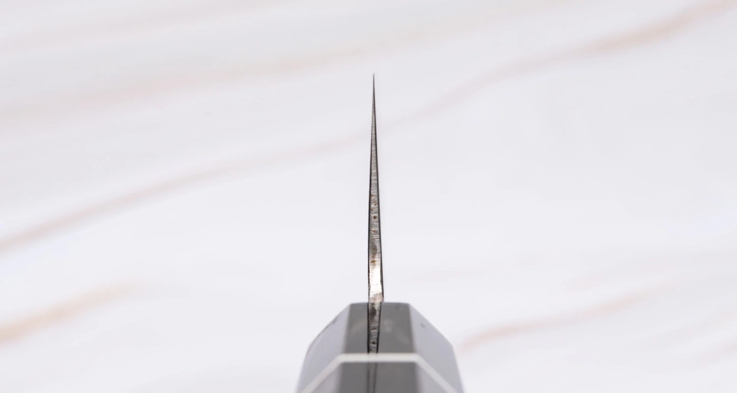 The double bevel blade, featuring a hamagri grind (for explanation, read the Blade Construction: Geometry article) measures 240mm (9.4″) in length and should work for chefs and experienced home cooks alike.