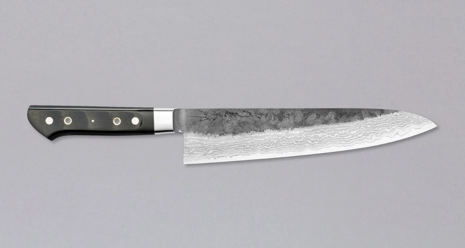 This hand-forged gyuto presents the top level of TOJIRO’s offer of multi-purpose, large chef’s knives. The excellent VG-10 core is hand-forged using the traditional method into a beautiful 63-layer Damascus pattern with black kuro-uchi patina. The handle is carefully made of black/green micarta with special handmade bronze fastening pins. Suitable for a demanding chef for home or professional use.