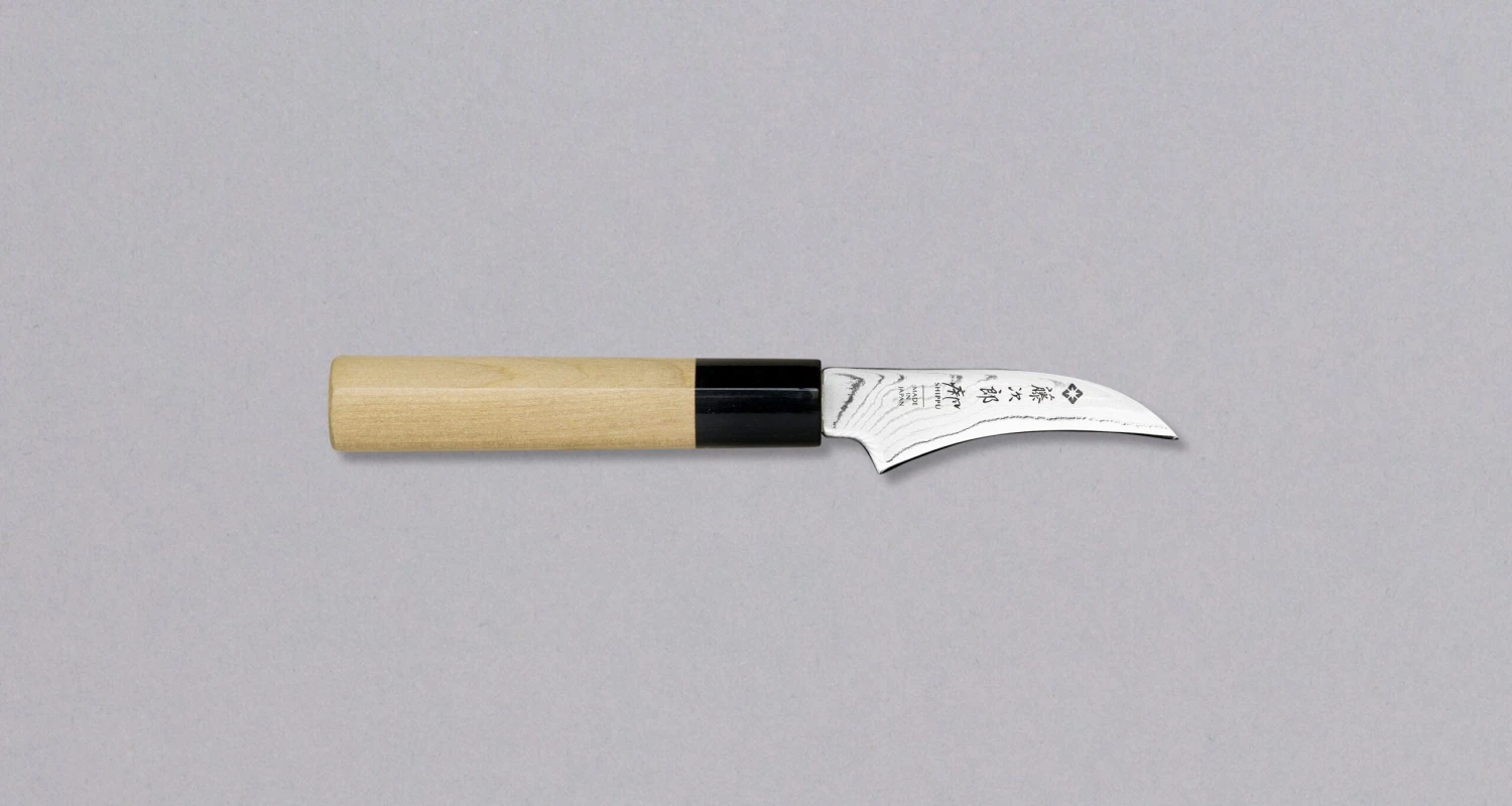 TOJIRO Bird’s Beak Paring Damascus knife is mostly used in a professional kitchen for peeling or carving fruits and vegetables and is especially essential to tourne vegetables (a French staple technique). It will come in handy in a home kitchen too, especially with peeling spherical fruits and veggies, although the standard shaped paring/petty knife should also do the trick.