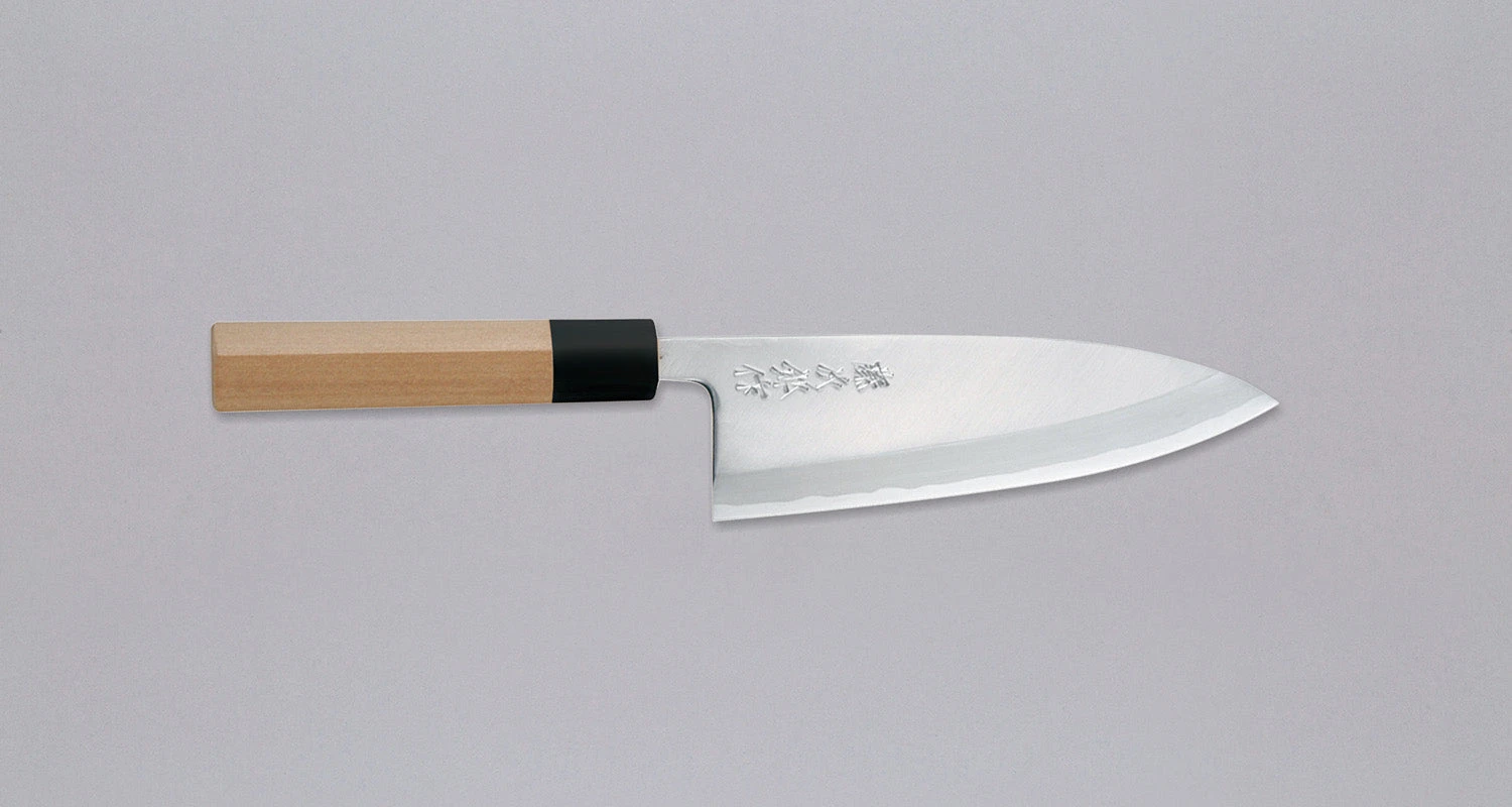 TOJIRO Deba Aogami #2 is a medium-sized deba designed fish lovers and professional chefs. The blade thickness is at hefty 8mm (0.3″), the blade length is 165mm (6.5″), so it is suitable for filleting larger fish. The knife handle is made from traditional magnolia wood with the ferrule from buffalo horn. It will be difficult to find a more traditional, classic deba knife than this one!
