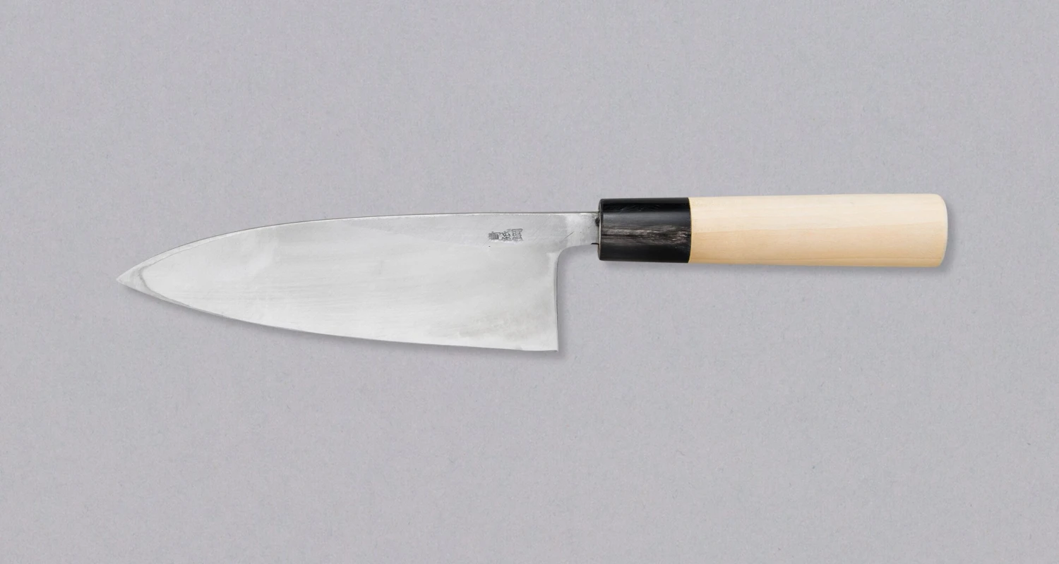 TOJIROÂ Deba Damascus Aogami #2Â is a medium-sized deba designed fish lovers and professional chefs. The blade thickness is at hefty 7mm (0.28″), the blade length is 165mm (6.5″), so it is suitable for filleting medium-sized fish. The knife handle is made from traditional magnolia wood with the ferrule from buffalo horn. It will be difficult to find a more traditional, classic deba knife than this one!