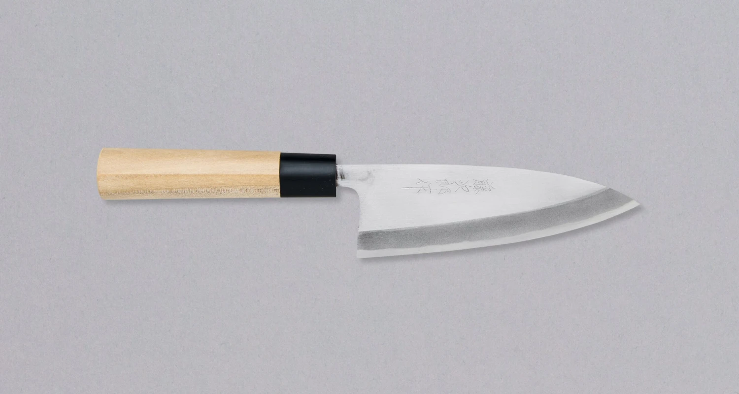 TOJIRO Deba Shirogami is a medium-sized deba designed fish lovers and professional chefs. The blade thickness is at hefty 7mm (0.28″), the blade length is 165mm (6.5″), so it is suitable for filleting medium-sized fish. The D-shaped handle is made from traditional magnolia wood with a resin ferrule.