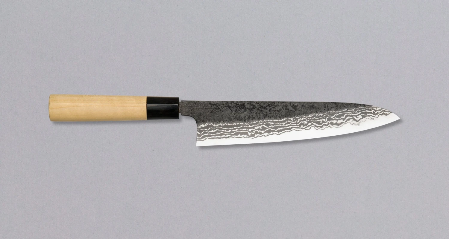 This hand-forged gyuto presents the top level of TOJIRO’s offer of multi-purpose, large chef’s knives. The excellent Aogami #2 core is hand-forged using the traditional method into a beautiful 21-layer Damascus pattern with black kuro-uchi patina. Suitable for a demanding chef for home or professional use!