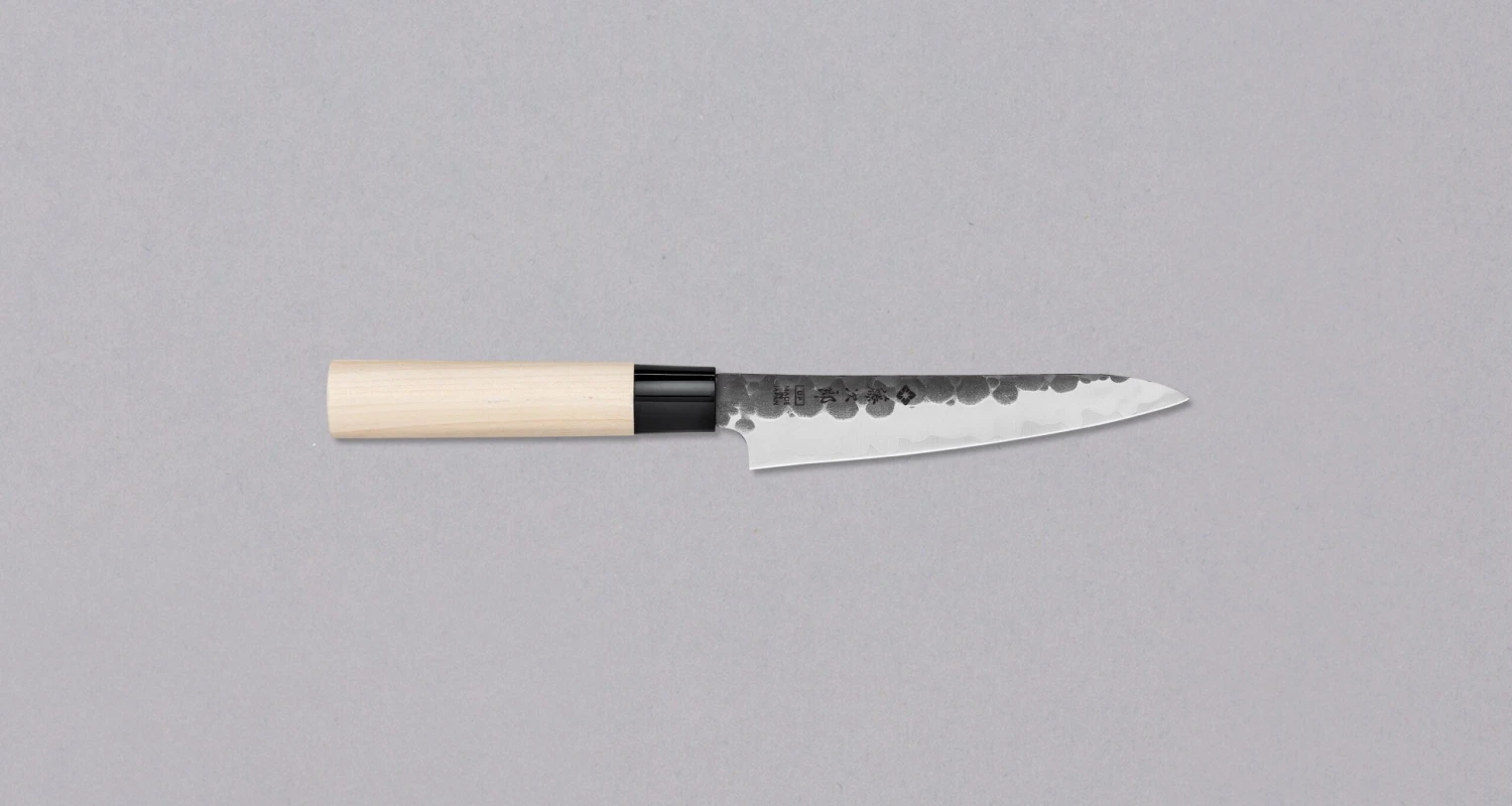 TOJIROย Pettyย DP Hammered 130mm (5.1″) is a new budget superstar from the hands TOJIRO’s blacksmiths.ย TOJIRO’s secret recipe of hardening VG-10 steel doesn’t disappoint with their new line of hammeredย kuro-uchiย knives either. The knife is very sharp out-of-the-box and is ready to make some (precise) damage to the food you’re about to prepare.ย Petty knives are very useful for all those smaller tasks where larger chef’s knives are deemed unwieldy. A must-have knife in every kitchen since it is used for peeling, paring and decorating food.