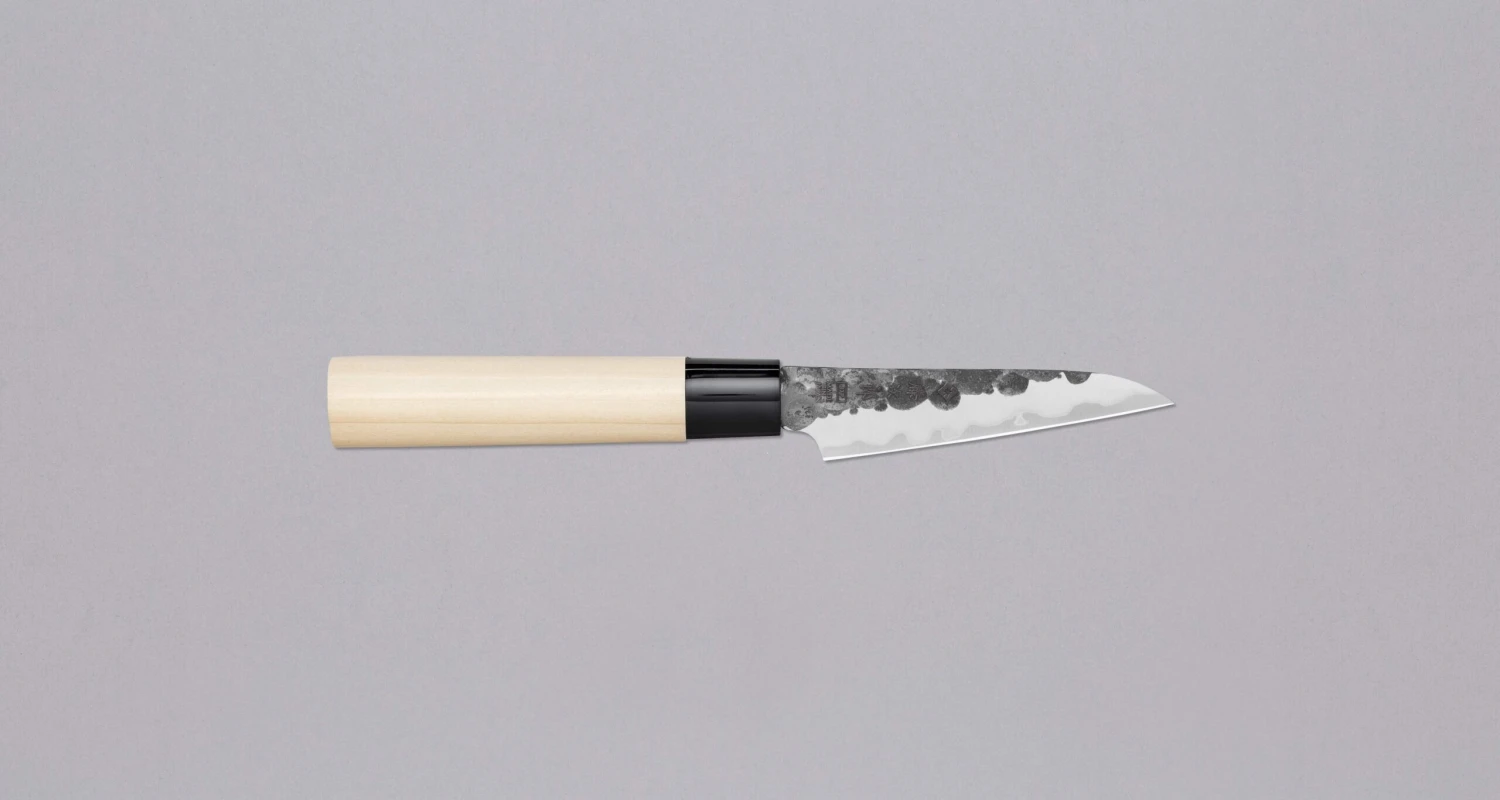 TOJIROย Pettyย DP Hammered 90mm (3.5″) is a new budget superstar from the hands TOJIRO’s blacksmiths.ย TOJIRO’s secret recipe of hardening VG-10 steel doesn’t disappoint with their new line of hammeredย kuro-uchiย knives either. The knife is very sharp out-of-the-box and is ready to make some (precise) damage to the food you’re about to prepare.ย Petty knives are very useful for all those smaller tasks where larger chef’s knives are deemed unwieldy. This petty can also work as an in-hand paring knife, so it can be used for peeling potatoes, cutting avocados, etc. It’s a very short knife,ย making it very helpful in tight spots and around the bones. Very useful to have at hand in a professional or home kitchen.