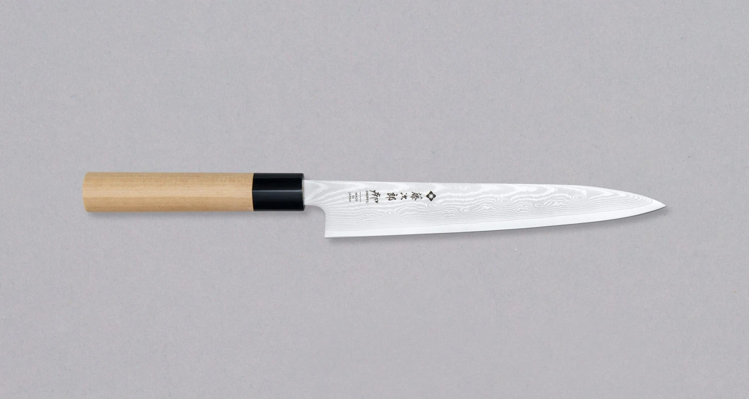 TOJIRO Slicer Damascus in 210mm blade length is a great selection for a handy, low-maintenance and affordable slicer knife. The 210mm (8.3″) size works well in professional kitchens with limited workspace or is the go-to length for home cooks.