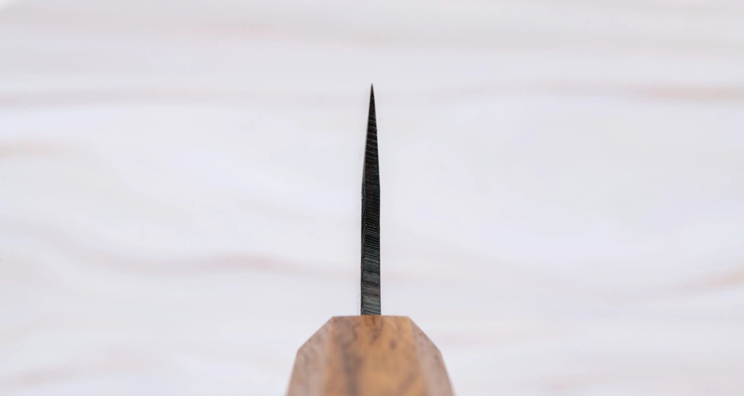 Viewed from the back of the blade, the knife is heavier and stronger at the handle and thinner and more precise at the tip. This blade shape makesย the knife easier to use because the blade is very responsive,ย easily maneuverable and nicely balanced. This type of blade design is also calledย distal taper – you can read more about it in the article on blade geometry.ย ย