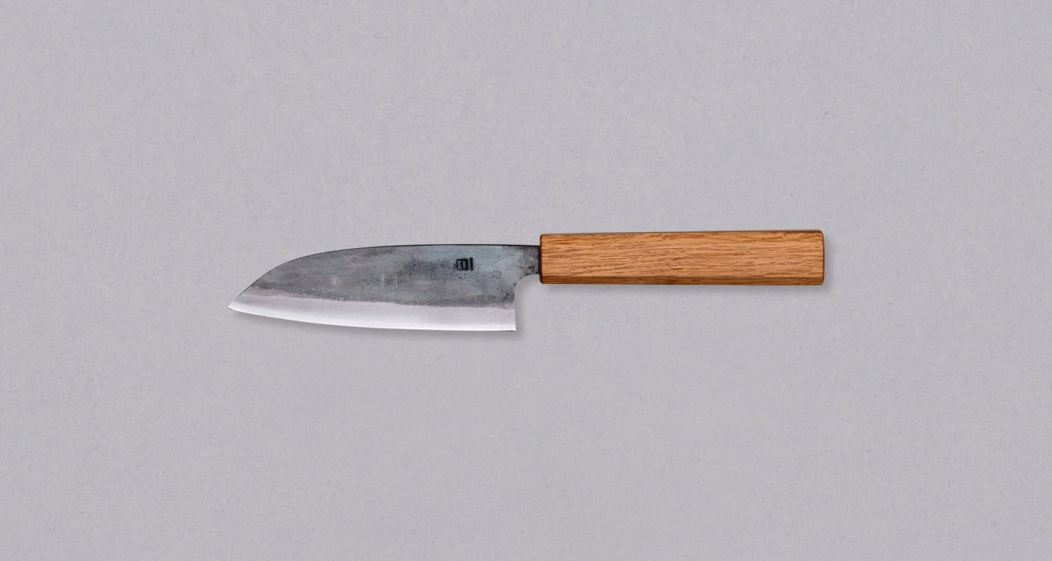 Tsukasa Santoku Shirogami #2 Oak 120mm is a small kitchen knife crafted by the highly skilled blacksmith Tsukasa Tokaji at the renowned Tokaji forge in Kōchi, Japan. This knife showcases the exceptional handmade quality and features a blade made from Shirogami #2 steel, well-known for its high carbon content and outstanding edge retention. Chefs and culinary enthusiasts praise Shirogami for its precision and finesse in slicing and dicing!