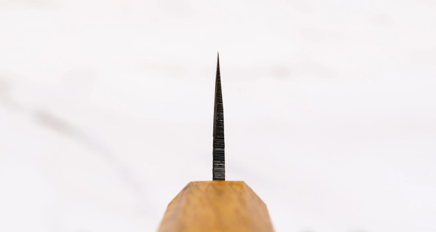 The blade was laminated with soft iron, which is iron with only a small amount of carbon added to it. Laminating the blade improves its structural integrity, as the knife’s core is made of hard—and therefore brittle—high-carbon Aogami #2 steel that is prone to breakage on its own.