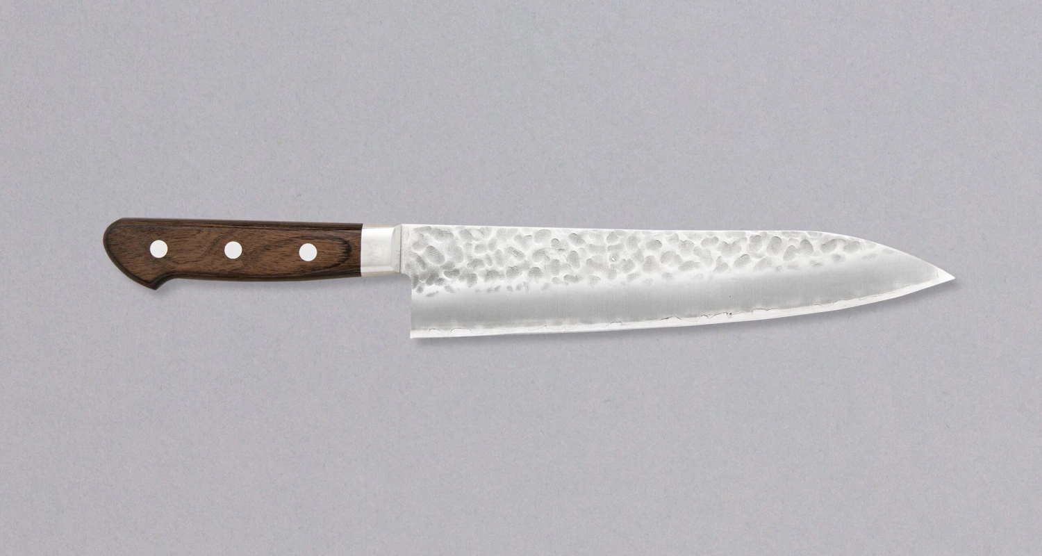 Tsunehisa AUS-8 Tsuchime Gyuto is a multi-purpose Japanese kitchen knife that can be used for different cutting techniques. Unique tsuchime blade finish, stainless steel, and a lightweight Western style handle made of pakka wood (known for its durability and comfortable grip), low maintenance and a price you don’t have to break the bank to buy one makes this gyuto a real bargain.