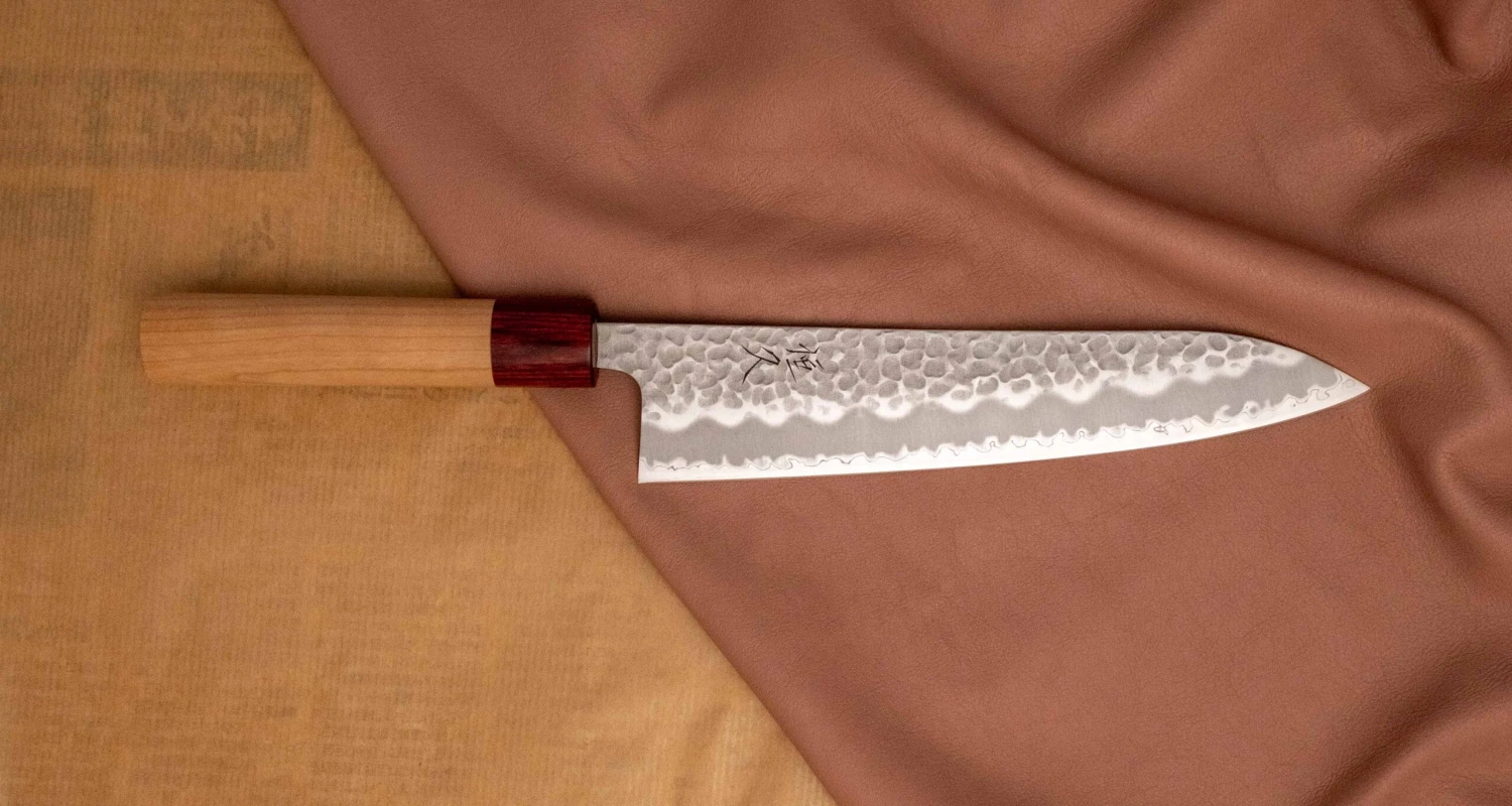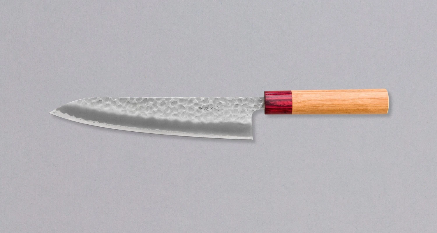 The Tsunehisa Gyuto Aogami Super Cherry 210mm (8.3″) is a multi-purpose knife with hammer dents and a beautiful cherry wood handle. Due to the choice of steel, the blade is also very easy to sharpen.