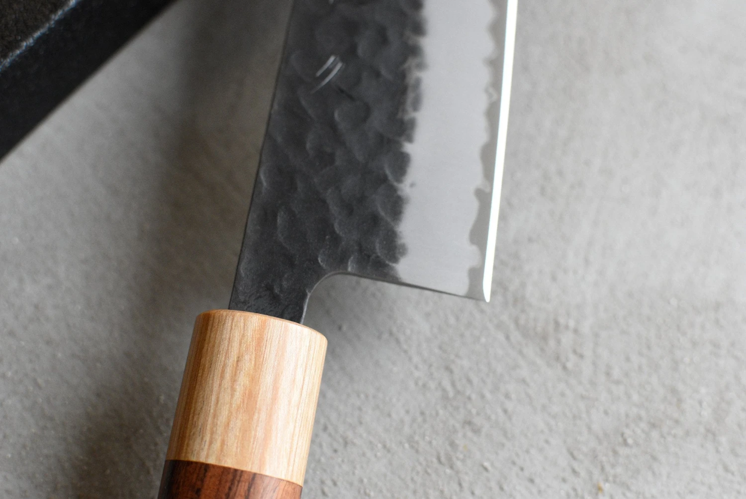 Kuro-uchi finish, the unprocessed (black) part on the top side of the blade has already developed a dark patina, which protects the blade and gives it a unique and rustic appearance. The blade was treated with hammer blows, resulting in a textured tsuchime look, which gives it a beautiful finish and also prevents food from sticking to the blade.
