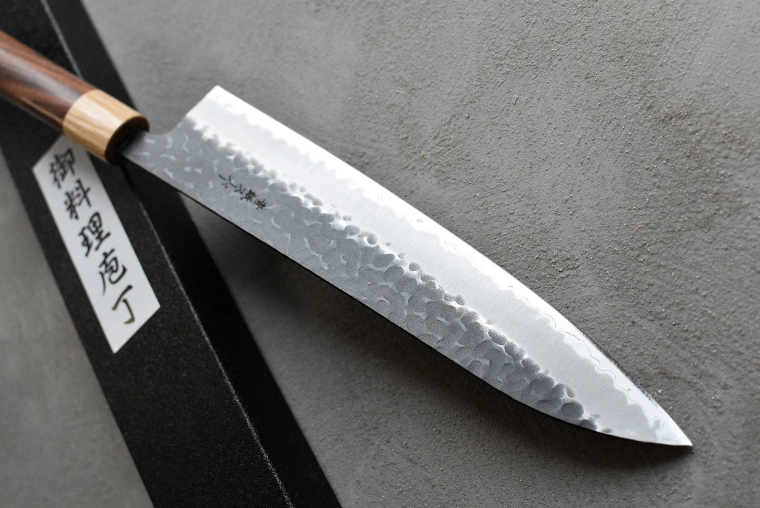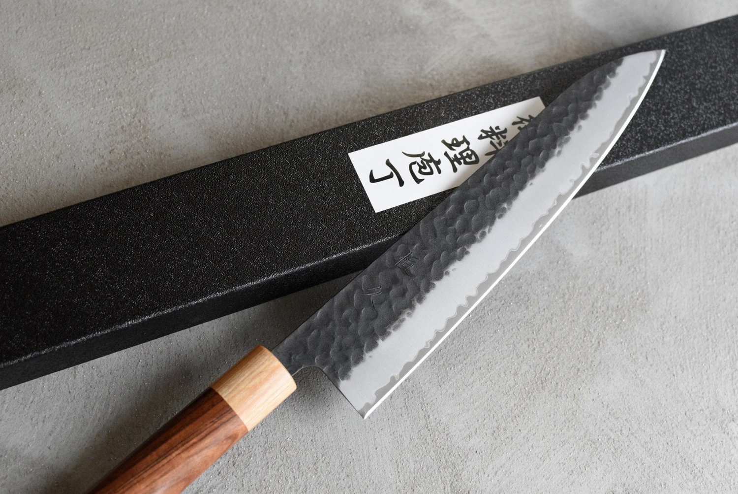 The core of this knife is Hitachi’s Super Blue Steel (Aogami Super), which is the very top quality of traditional Japanese steels. The Kuro-uchi (black) patina on the upper part of the knife gives it a unique and rustic appearance. This knife was heat-treated to around 63 HRC. It is a very hard steel, meaning that it will retain a super-fine sharpness for a long time. In addition, due to the high carbon content (1.4-1.5%), the knife is very easy to sharpen. Among the high carbon steels, Aogami Super is also the least sensitive to rust. It also contains 0.4% vanadium as an admixture for micronized metal grains, which gives the steel more toughness. Aogami Super is rated as the most advanced carbon steel. The outer layers are of softer, stainless steel, giving the knife extra rust protection.