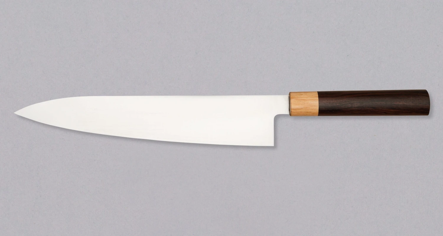 This 270mm (10.6″) Gyuto’s blade, at just 2.2mm (0.08″), is among the thinnest we have in our range. The knife has an immaculate “out of the box” sharpness, laser-thin spine of the blade, good balance and offers a lightweight feeling while in use.