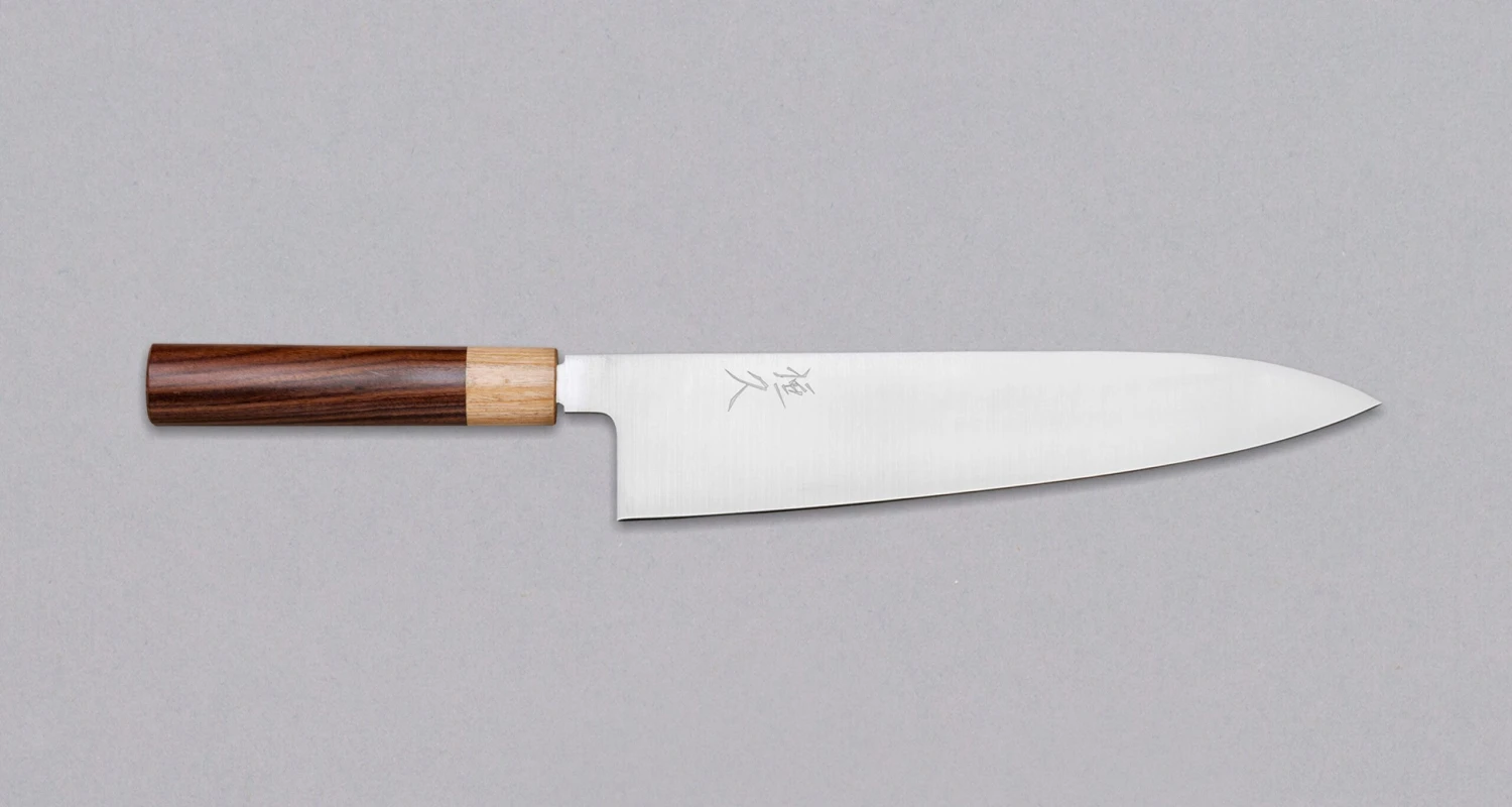 Gyuto knife is a Japanese version of traditional European Chef knife; a multi-purpose knife, where blade lengths vary from 210mm (8.3″) to as long as 300mm (11.8″). The longer ones primarily for cutting larger chunks of meat, while the shorter ones excel at slicing vegetables and cutting a steak or two.