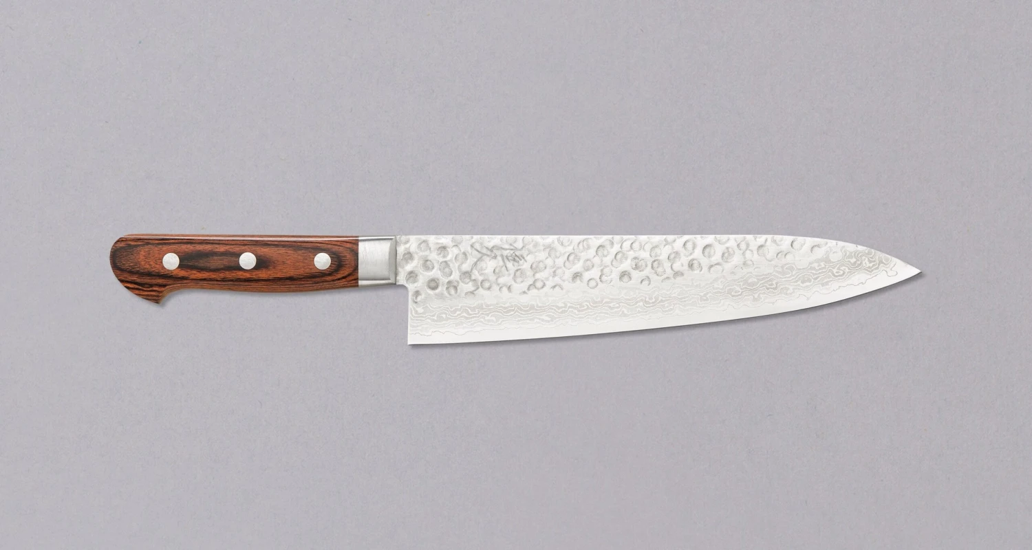 Tsunehisa Gyuto VG-10 Damascus Brown 210mm is a versatile multi-purpose kitchen knife that will shine with all kinds of chopping, slicing and rocking motions on the kitchen board. The knife features a beautiful combination of tsuchime and damascus pattern. The knife is simple to maintain, retains its edge for a very long time and is perfect for sharpening on water stones.